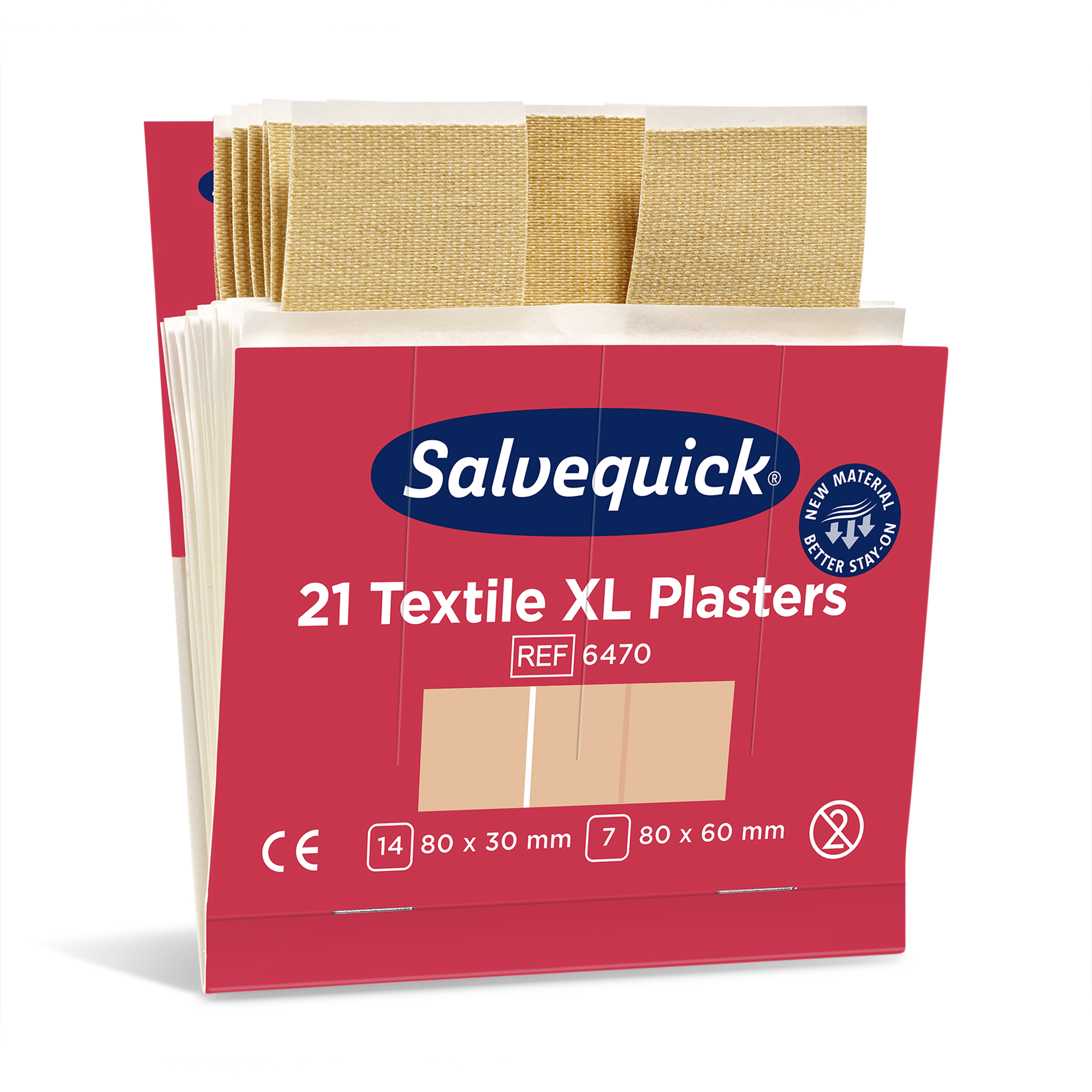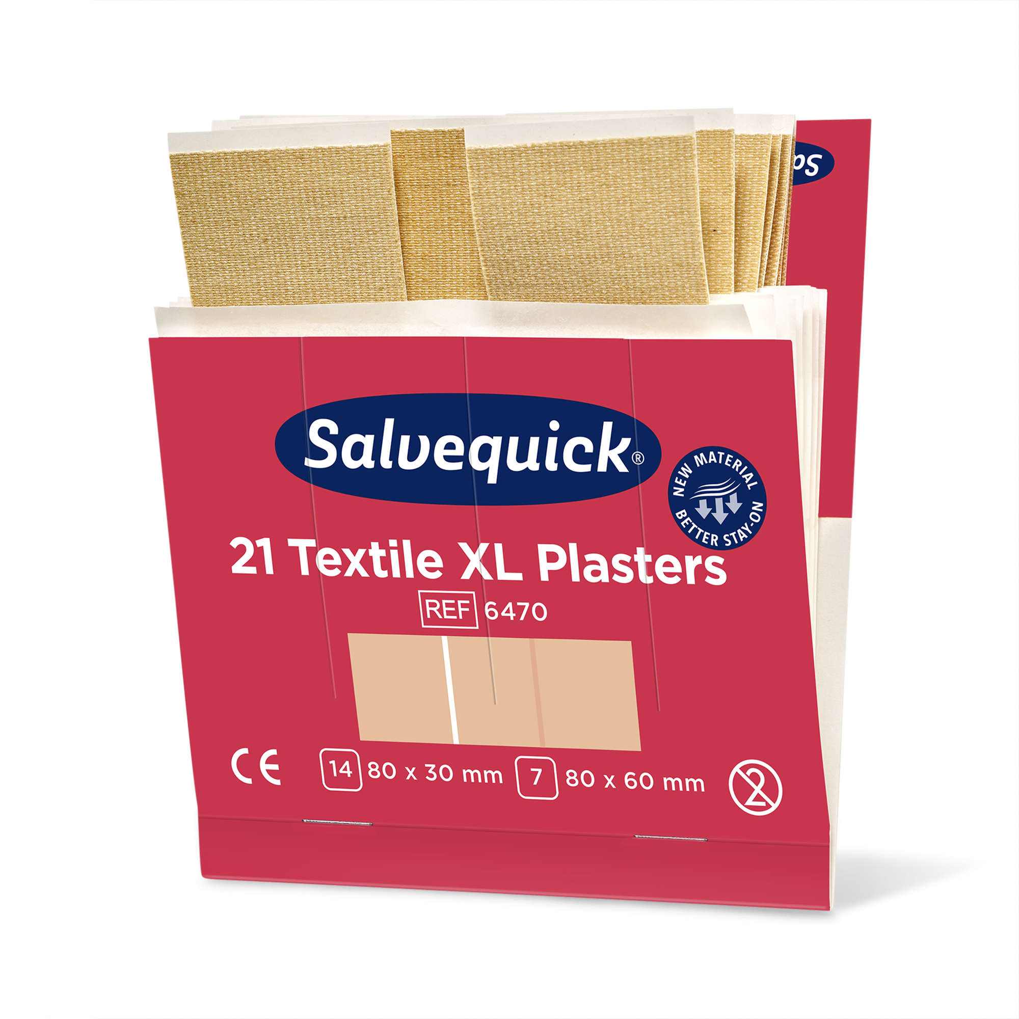 Salvequick Extra Stora Textilplåster är följsamma plåster av hög kvalitet. De är lätta att applicera, flexibla och smidiga att använda. Allergivänliga plåster. Salvequick Textilplåster refill passar i Salvequick Plåsterautomat.