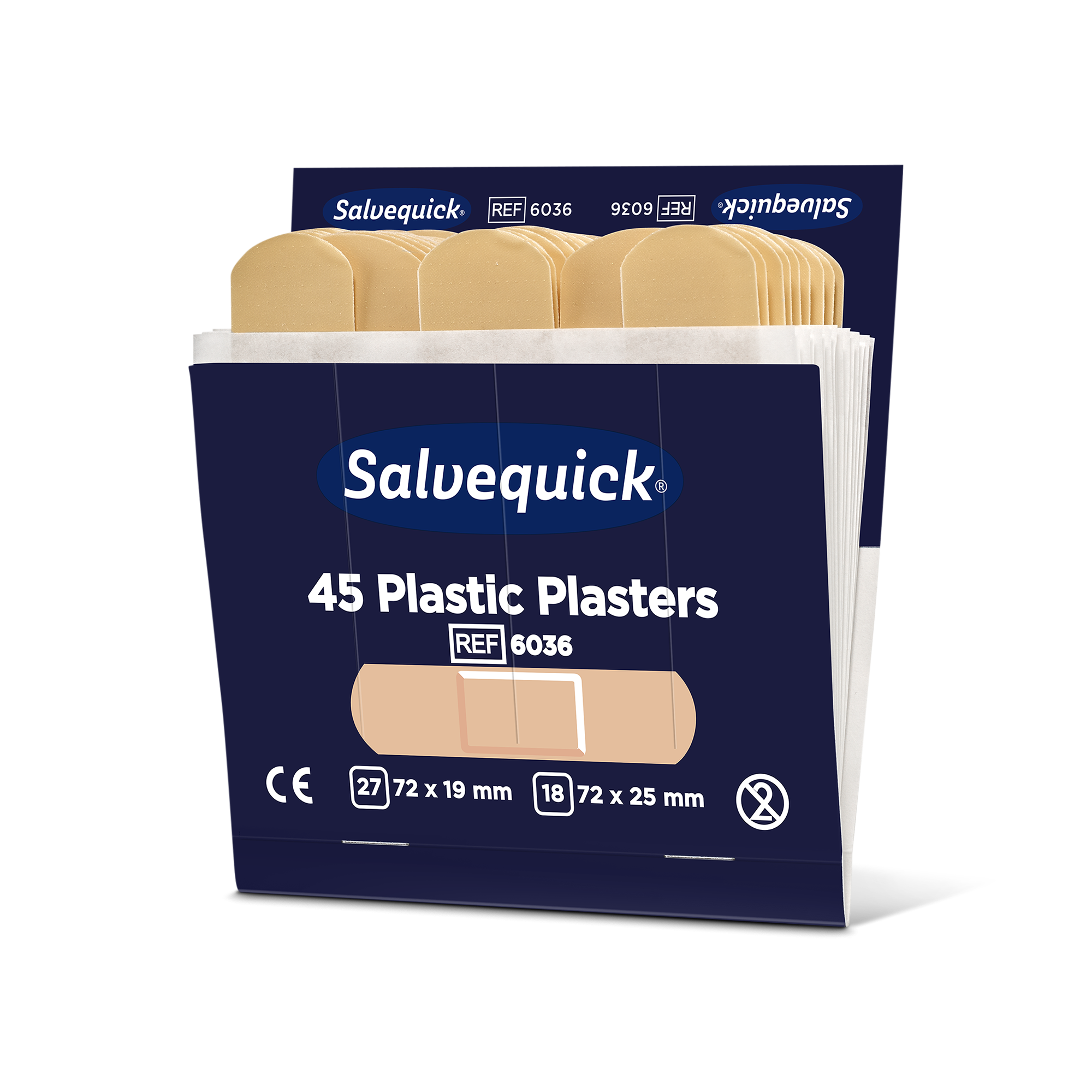 Salvequick Plastplåster är smidiga plåster av hög kvalitet. De är lätta att applicera, flexibla och smidiga att använda. Allergivänliga plåster. Salvequick Plastplåster refill passar i Salvequick Plåsterautomat