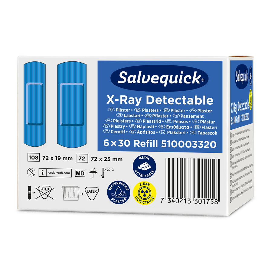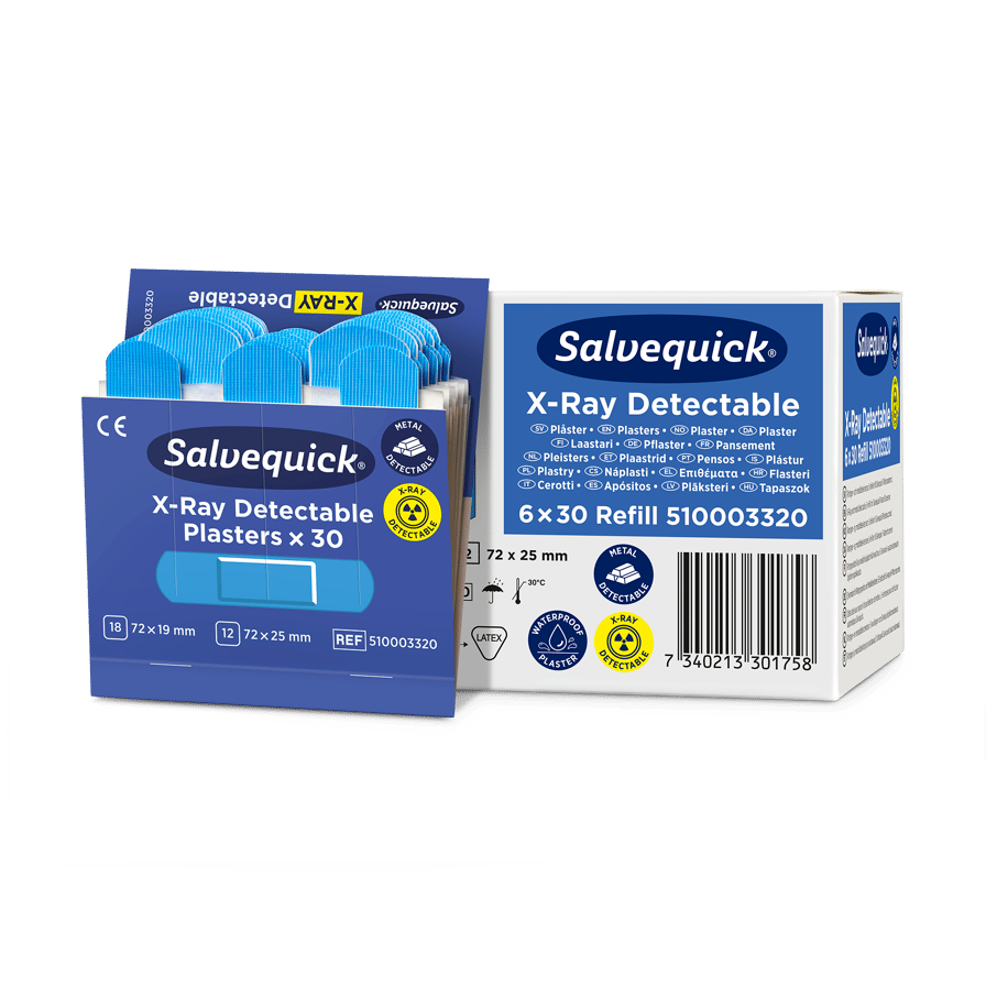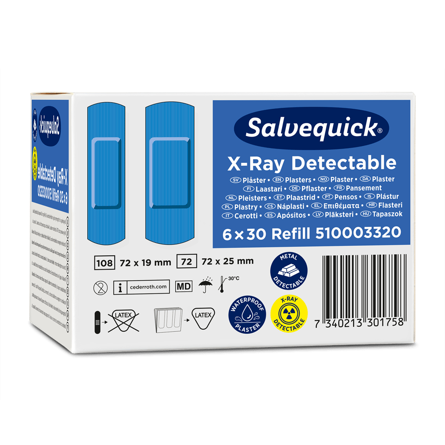 Salvequick Blue X-Ray Detectable Plåster är speciellt utformade för användning inom livsmedelsindustrin. Plåstren är både röntgen- och metalldetekterbara. Den blå färgen gör att plåstren är lätta att upptäcka visuellt. Plåstren är vattentäta och allergitestade. De är lätta att applicera, flexibla och smidiga att använda. Passar till Salvequick Plåsterautomat. Varje refill innehåller 30 plåster (18st 72x19 mm och 12 st 72x25 mm). 6 refiller/ask.