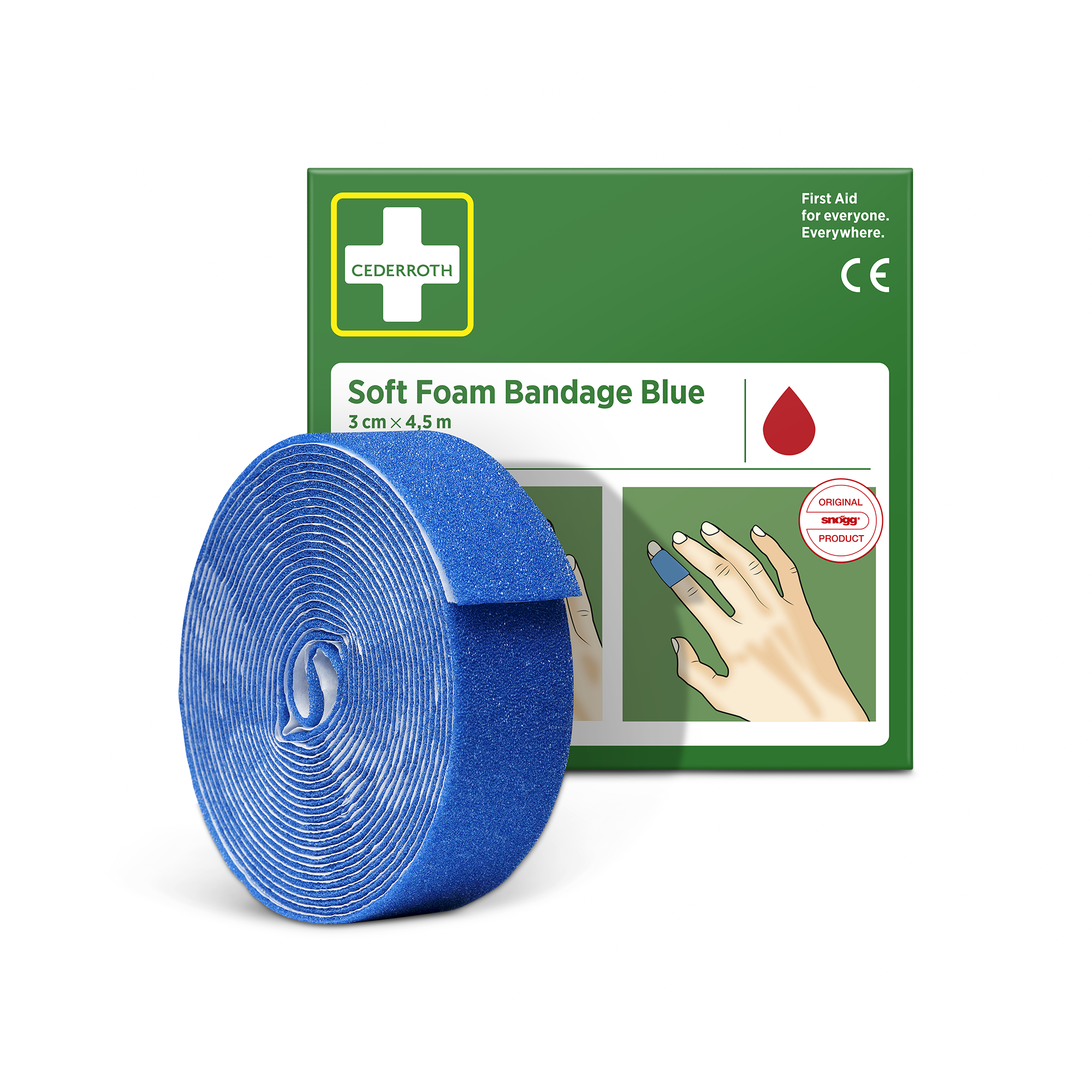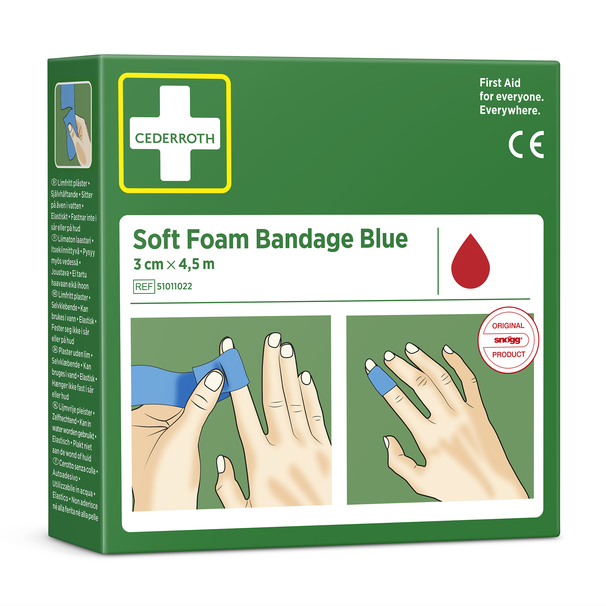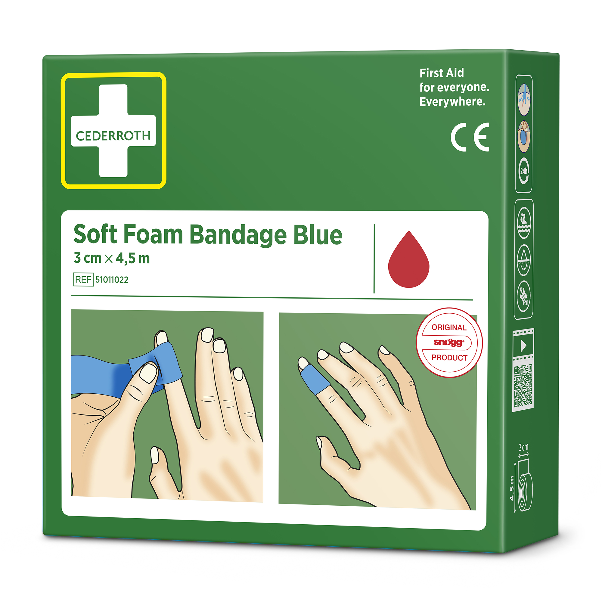 Cederroth Soft Foam Bandage Blue 3 cm x 4,5 m passar perfekt för fingrar eller tår. Lätt att linda runt små händer eller när du har ett mindre sår. Det fungerar både som plåster och som bandage. Förbandet passar på alla typer av små sår oberoende av värme, kyla, vått eller torrt och sitter kvar även i vatten. Cederroth Soft Foam Bandage är ett självhäftande limfritt plåster och klibbar därför inte fast i hud eller hår. Riv enkelt av en passande bit och linda runt det skadade området. Cederroth Soft Foam Bandage är idealiskt för snabb och enkel sårvård. Den blå färgen syns bra och är lämplig att använda vid livsmedelshantering. Passar som refill till Soft Foam Bandage 2-in-1 Dispenser (REF 510004108).