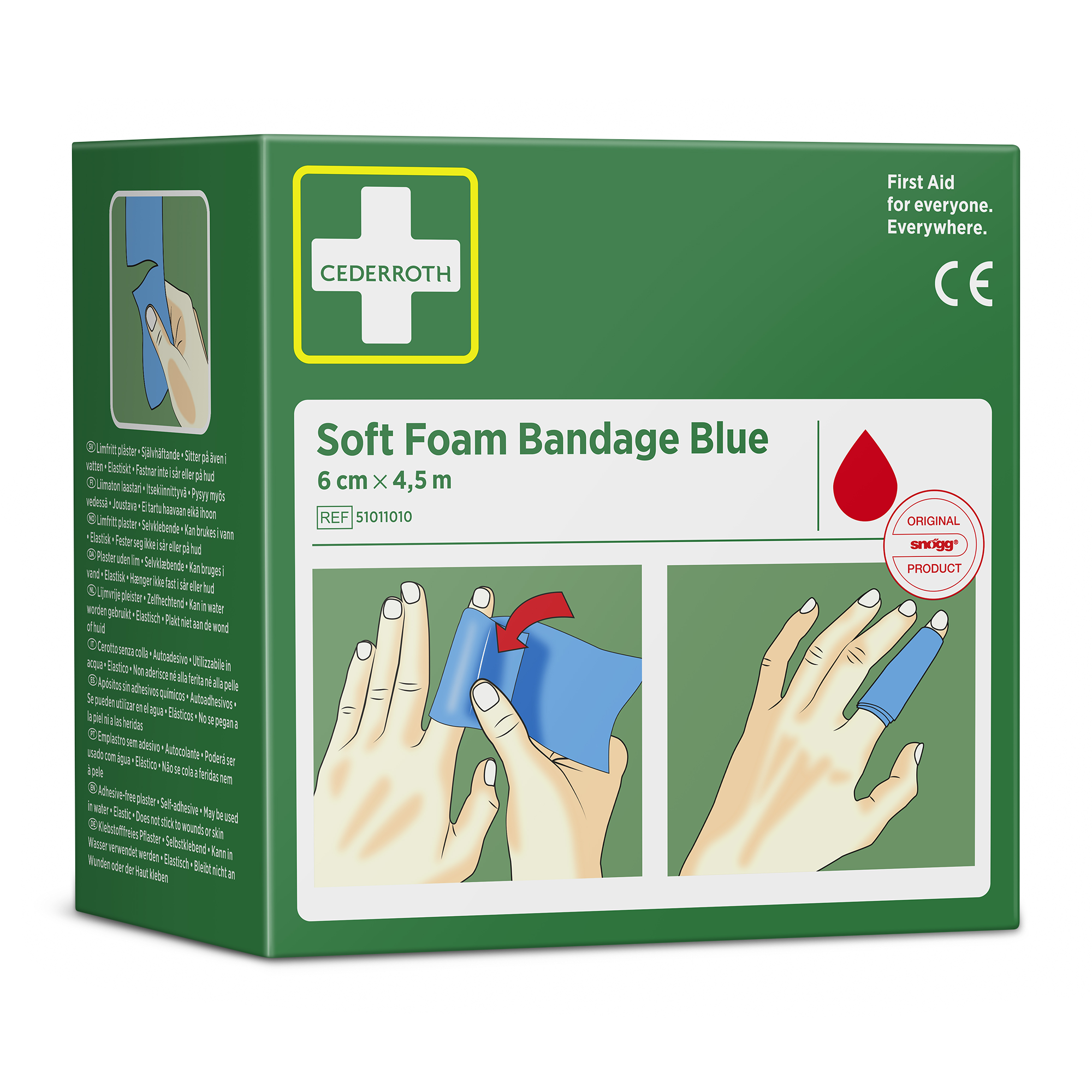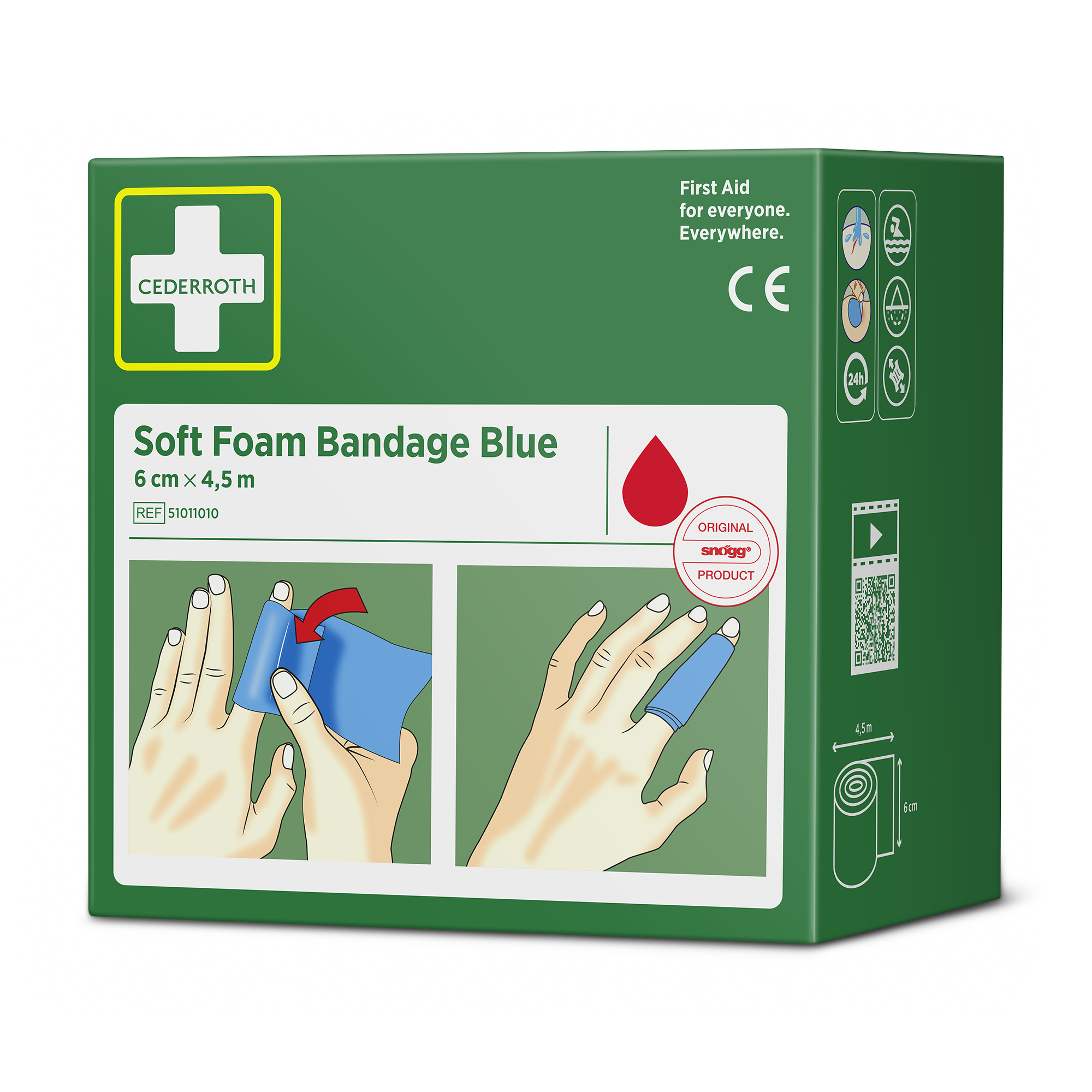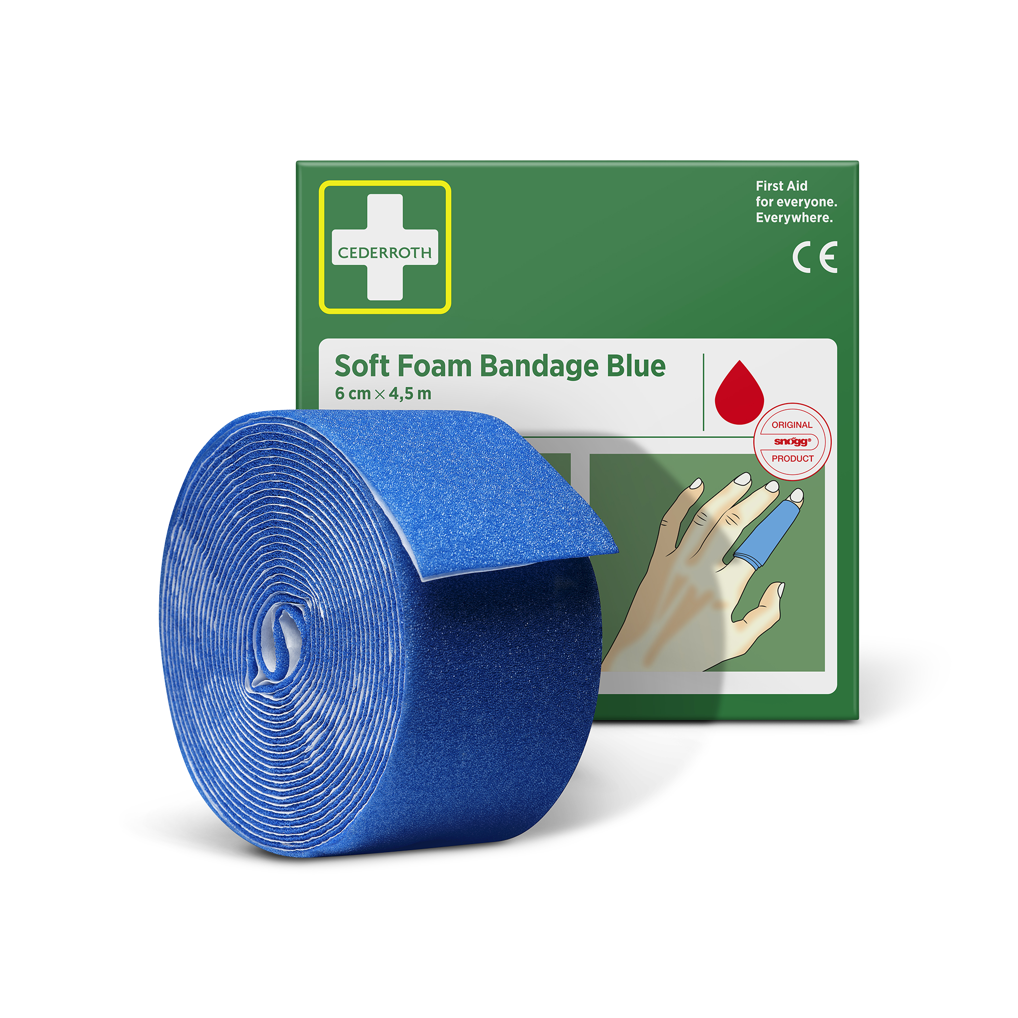 Cederroth Soft Foam Bandage Blue 6 cm x 4,5 m fungerar både som plåster och som bandage. Förbandet passar på alla typer av små sår oberoende av värme, kyla, vått eller torrt och sitter kvar även i vatten. Cederroth Soft Foam Bandage är ett självhäftande limfritt plåster och klibbar därför inte fast i hud eller hår. Riv enkelt av en passande bit och linda runt det skadade området. Vid kraftig blödning forma en bit Soft Foam Bandage som en ”kudde” för att skapa ett tryckförband. Cederroth Soft Foam Bandage är idealiskt för snabb och enkel sårvård. Passar som refill till Wound Care Dispenser (REF 51011009 & 51011006) och Cederroth Soft Foam Bandage 2-in-1 Dispenser (REF 510004108).
