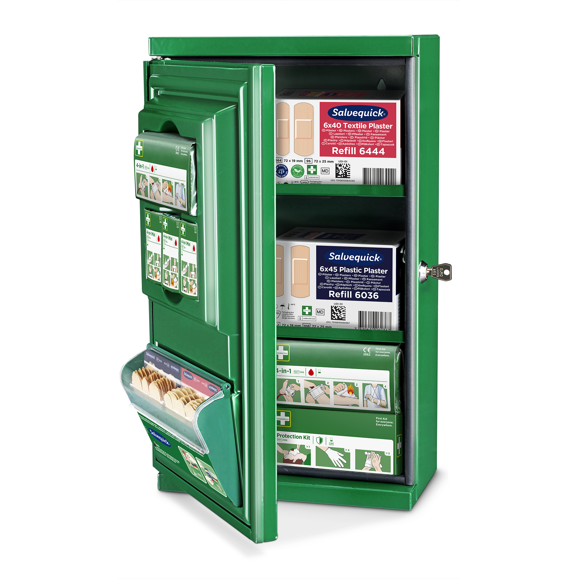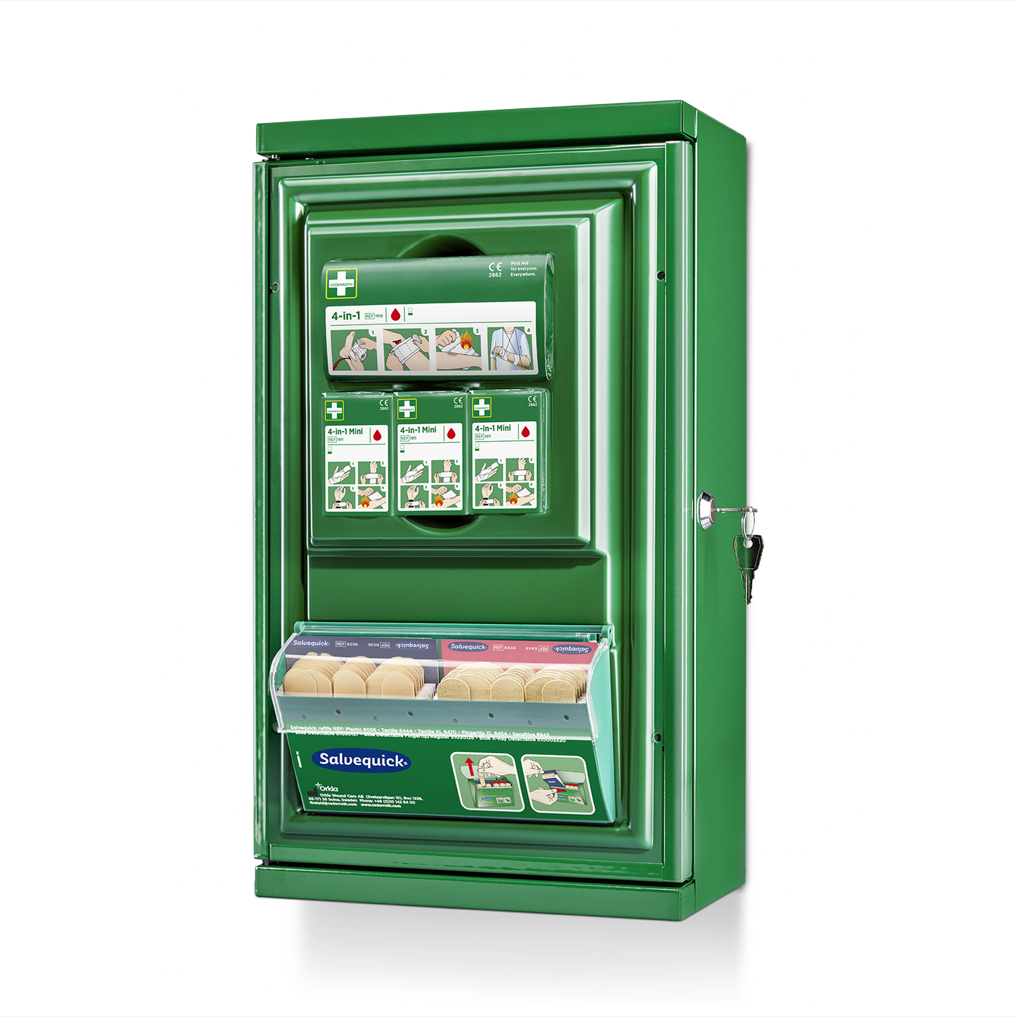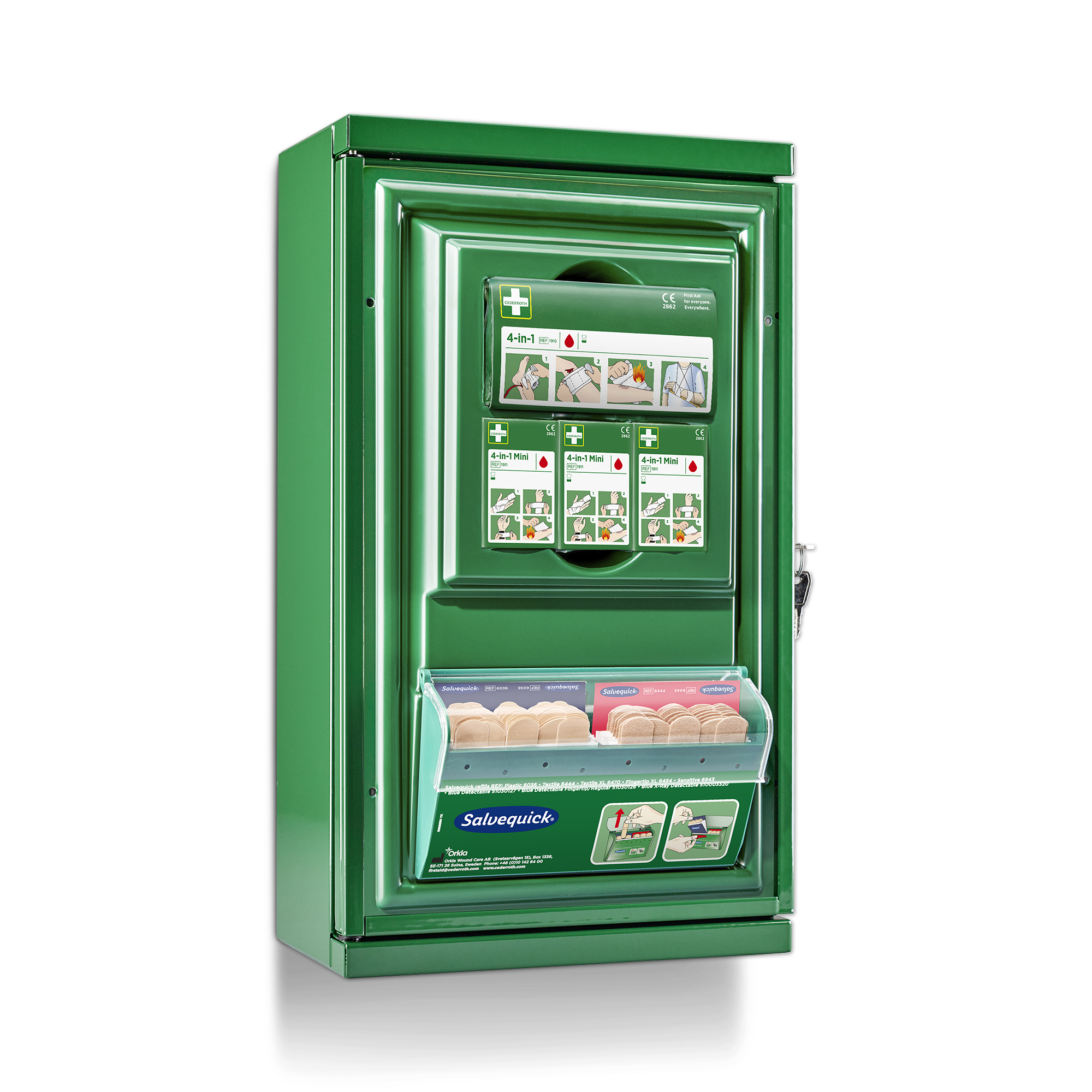 Cederroth Första Hjälpen-skåp Mini är ett mindre plåtskåp med Cederroth Första Hjälpen-tavla Mini monterad på dörren. I det låsbara skåpet förvaras påfyllningsartiklar. Cederroth Första Hjälpen-tavla Mini kan även köpas separat (REF 191400). Innehåll: 1 st Cederroth 4-in-1 Blodstoppare. 3 st Cederroth 4-in-1 mini Blodstoppare. 1 st Salvequick Plåsterautomat. Innehåll skåp: 1 ask (6x45 st) Plastplåster. 1 ask (6x40 st) Textilplåster. 1 st Skyddspaket. 1 st Cederroth 4-in-1 Blodstoppare. 1 st Cederroth 4-in-1 mini Blodstoppare. Sax och pincett.