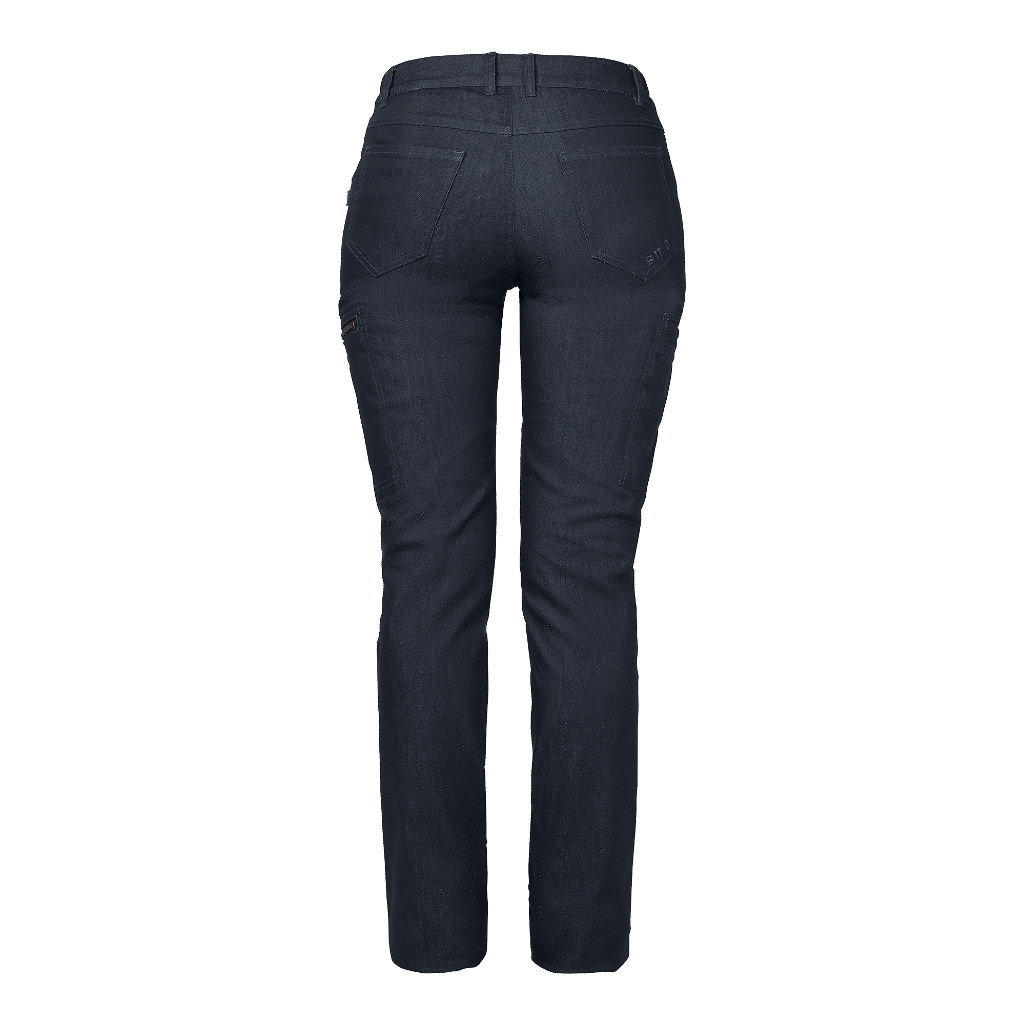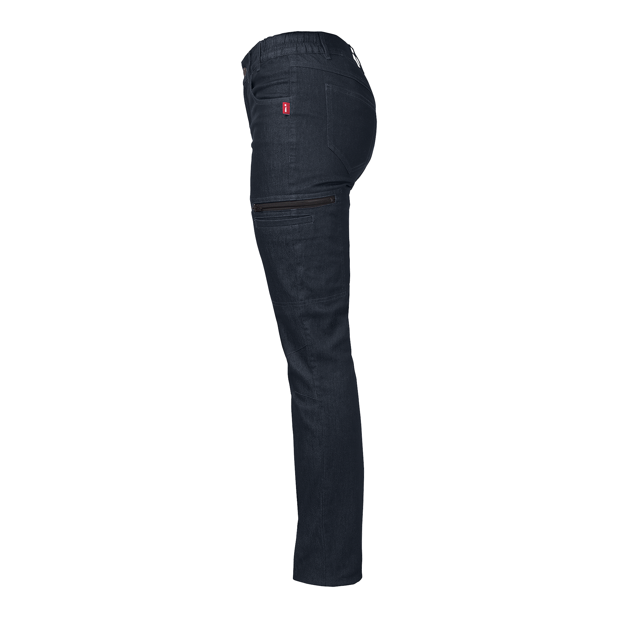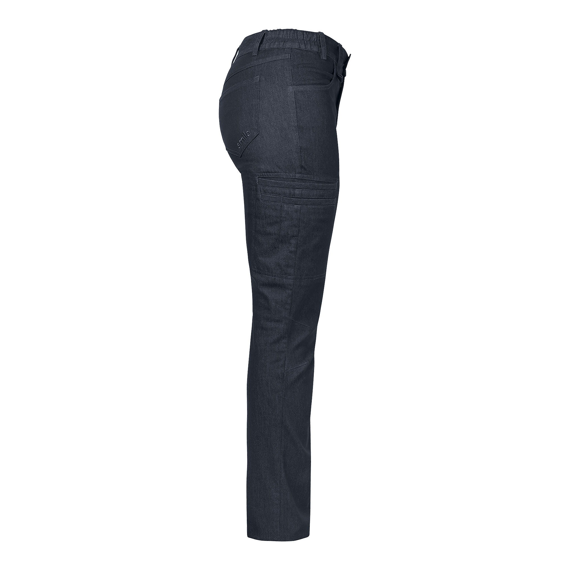 Plaggtvättad denimbyxa dam i workermodell med stretch. Utrustad med fram- och bakfickor, dubbel benficka med dragkedja, mobilficka, pennficka samt fast linning med resår i sidorna och bälteshällor. Tum storlek.