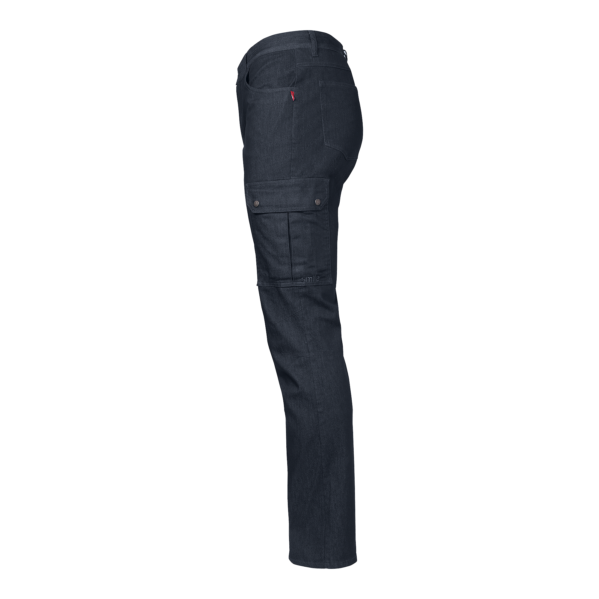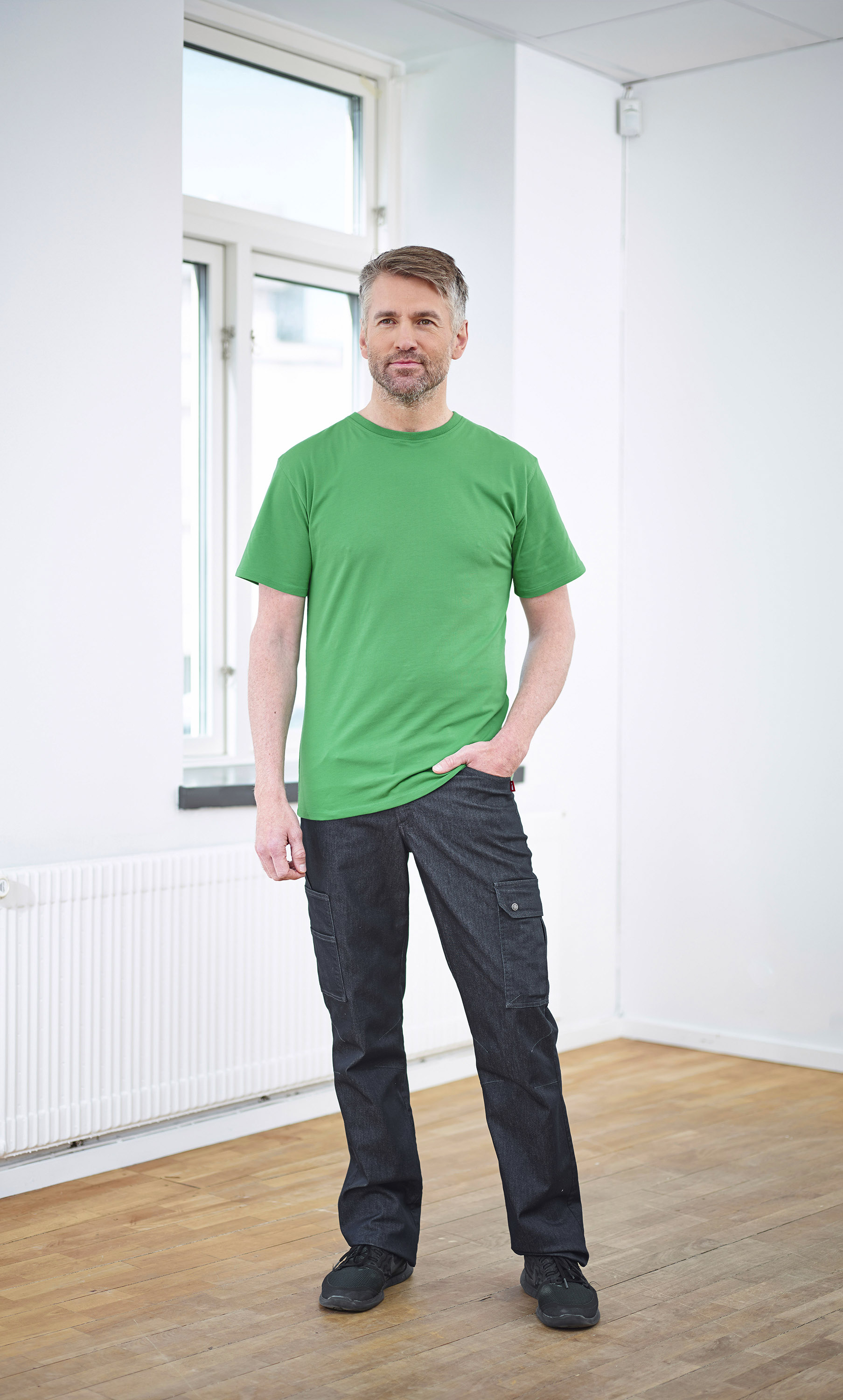 Plaggtvättad denimbyxa herr i workermodell med stretch. Utrustad med fram- och bakfickor, bälgficka med mobilficka, tum- och pennficka samt dubbel benficka. Fast linning, bälteshällor, nyckelhållare och gylf med blixtlås. Tum storlek.