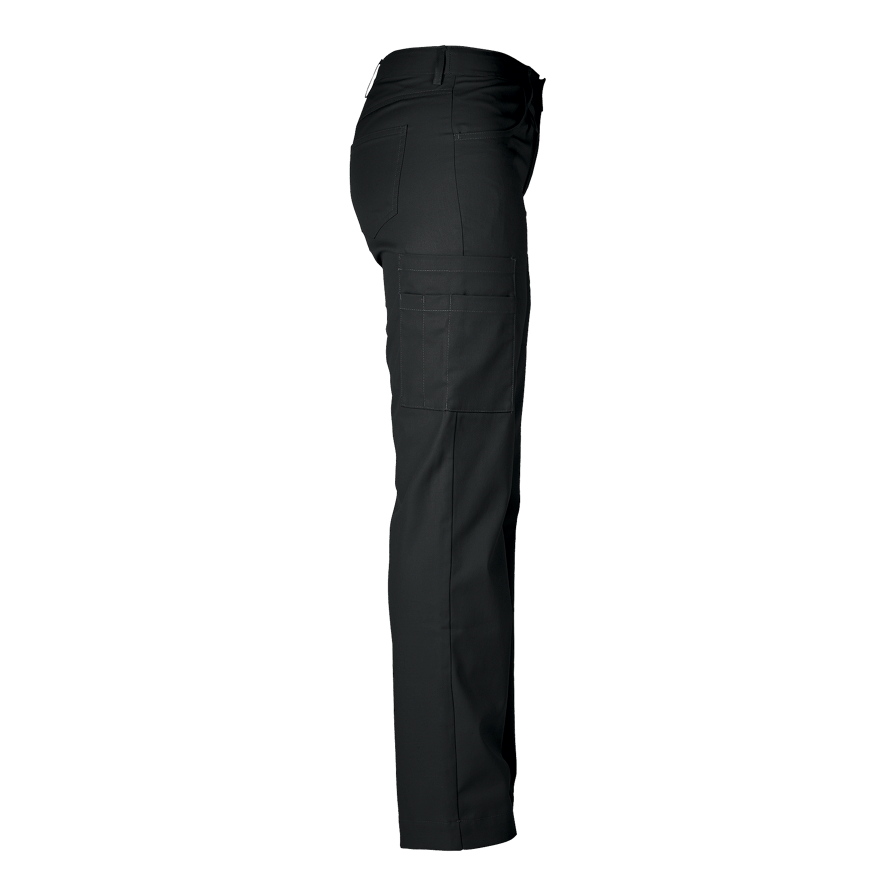 Modern byxa med bra passform och stretch. Utrustad med gylf, knapp, linning med bälteshällor, framfickor, påsydda bakfickor och dubbel benficka på höger ben. Nyckelhållare fram.