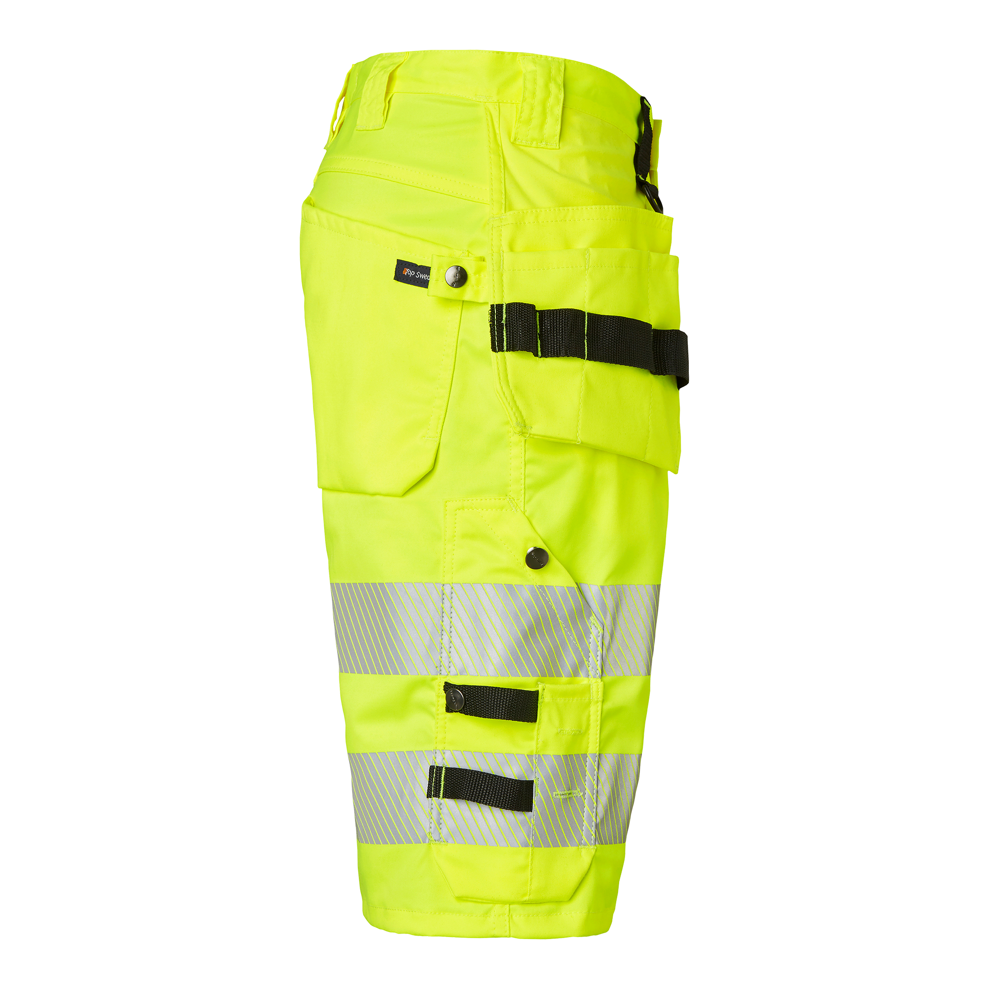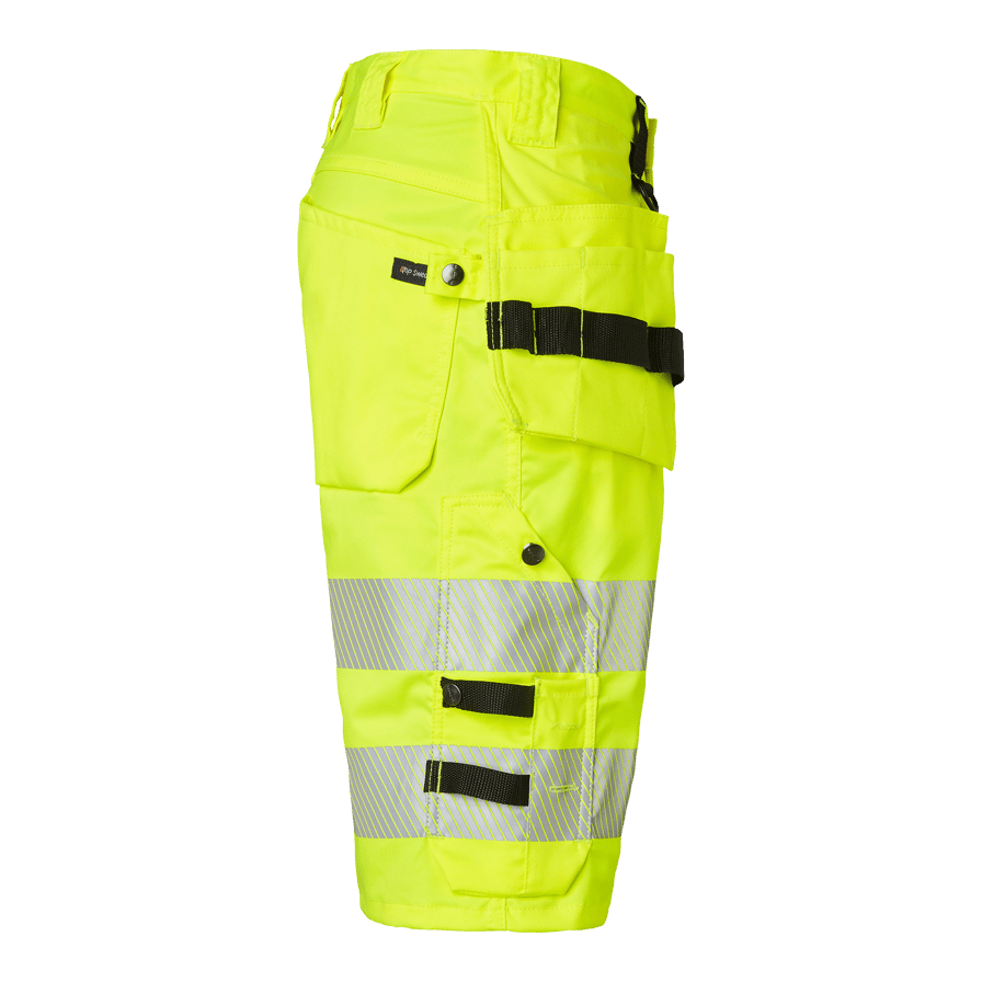 Upptäck Top Swedes 304 Craftsmen Shorts, de ultimata hantverksshortsen med varselfunktion för yrkesverksamma inom bygg och industri. Dessa shorts är helt tillverkade i komfortstretch för maximal rörelsefrihet och komfort under arbetsdagen. De har två framfickor, två förstärkta bakfickor och två löst hängande spikfickor med extra fack, verktygshällor och en dold ID-kortsficka som kan fällas ner. Shortsen är utrustade med en reglerbar hammarhank och en D-ring för extra verktyg. Tumstocksfickan, släppt nertill för bättre komfort, har två knivhållare, hälla och pennfack. Dessutom finns en benficka med dragkedja och en med lock och telefonficka. Den fluorescerande gula färgen och reflexdetaljerna säkerställer hög synlighet på arbetsplatsen. Välj 304 Craftsmen Shorts för en kombination av hållbarhet, funktionalitet och komfort i dina arbetskläder, perfekt för varma arbetsmiljöer där synlighet och rörlighet är avgörande.