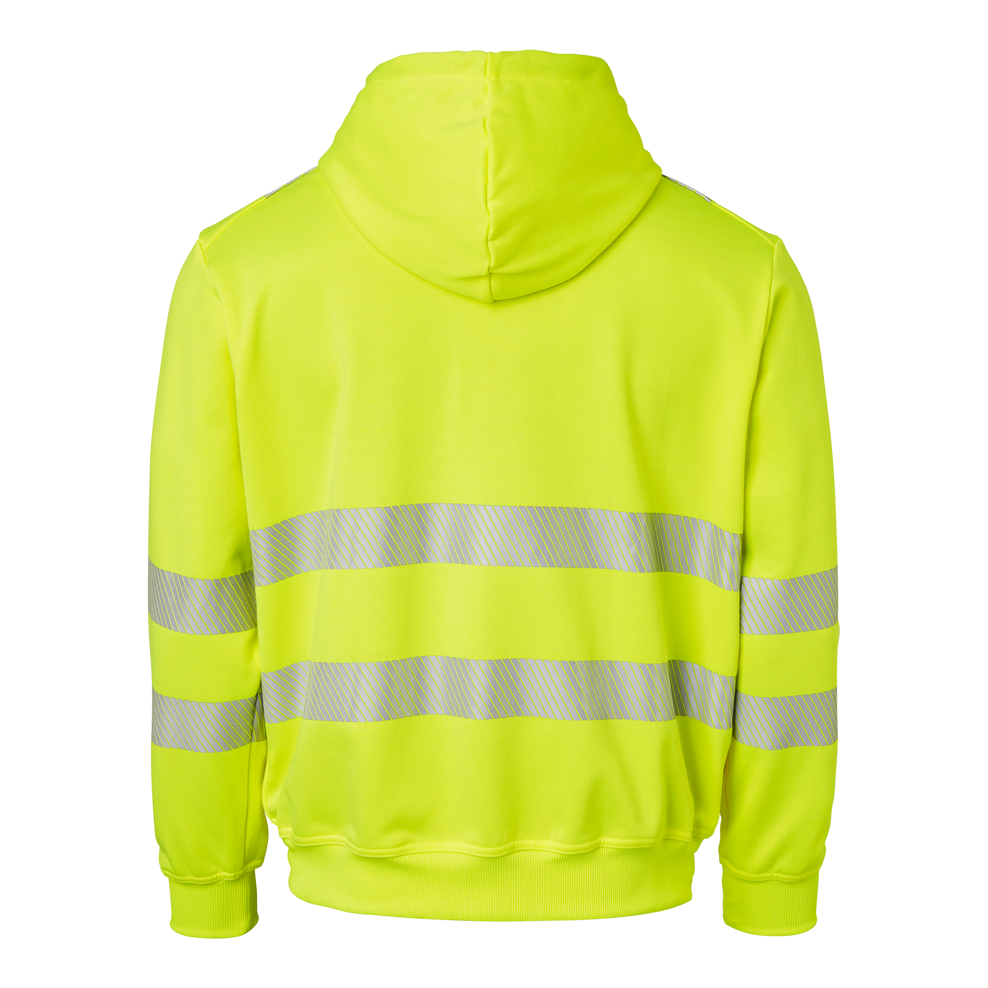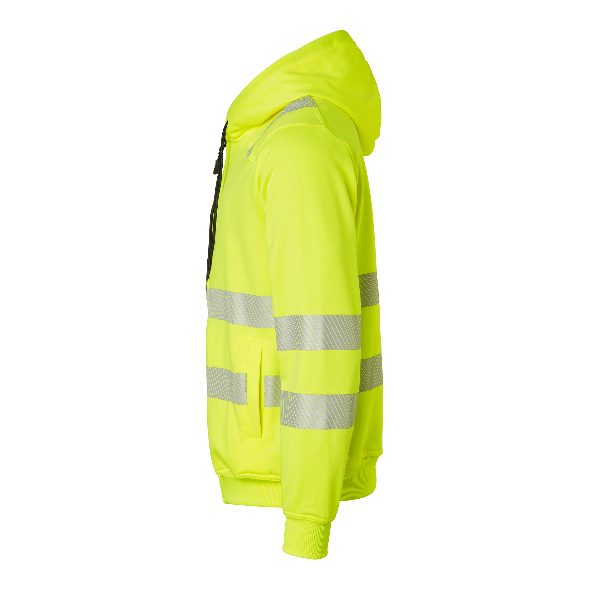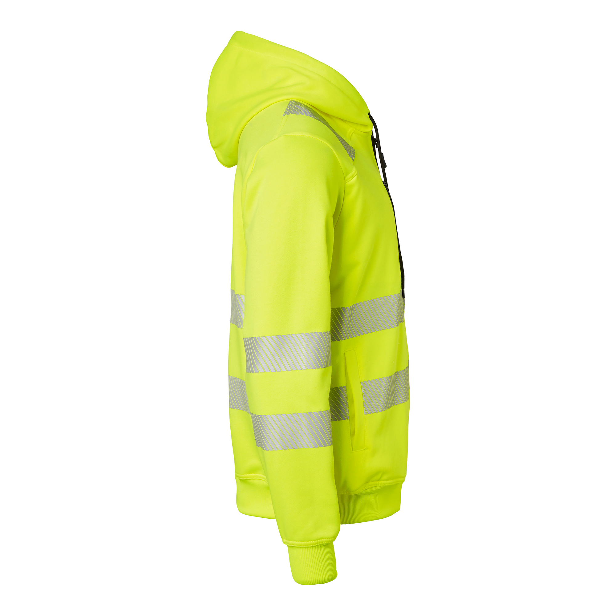 Sweatshirt med huva och hel dragkedja. Två framfickor och en bröstficka med dragkedja. Skuren reflex med stretch, mudd i nederkant och ärmslut. Perfekt för hög synlighet och komfort i arbetsmiljöer.