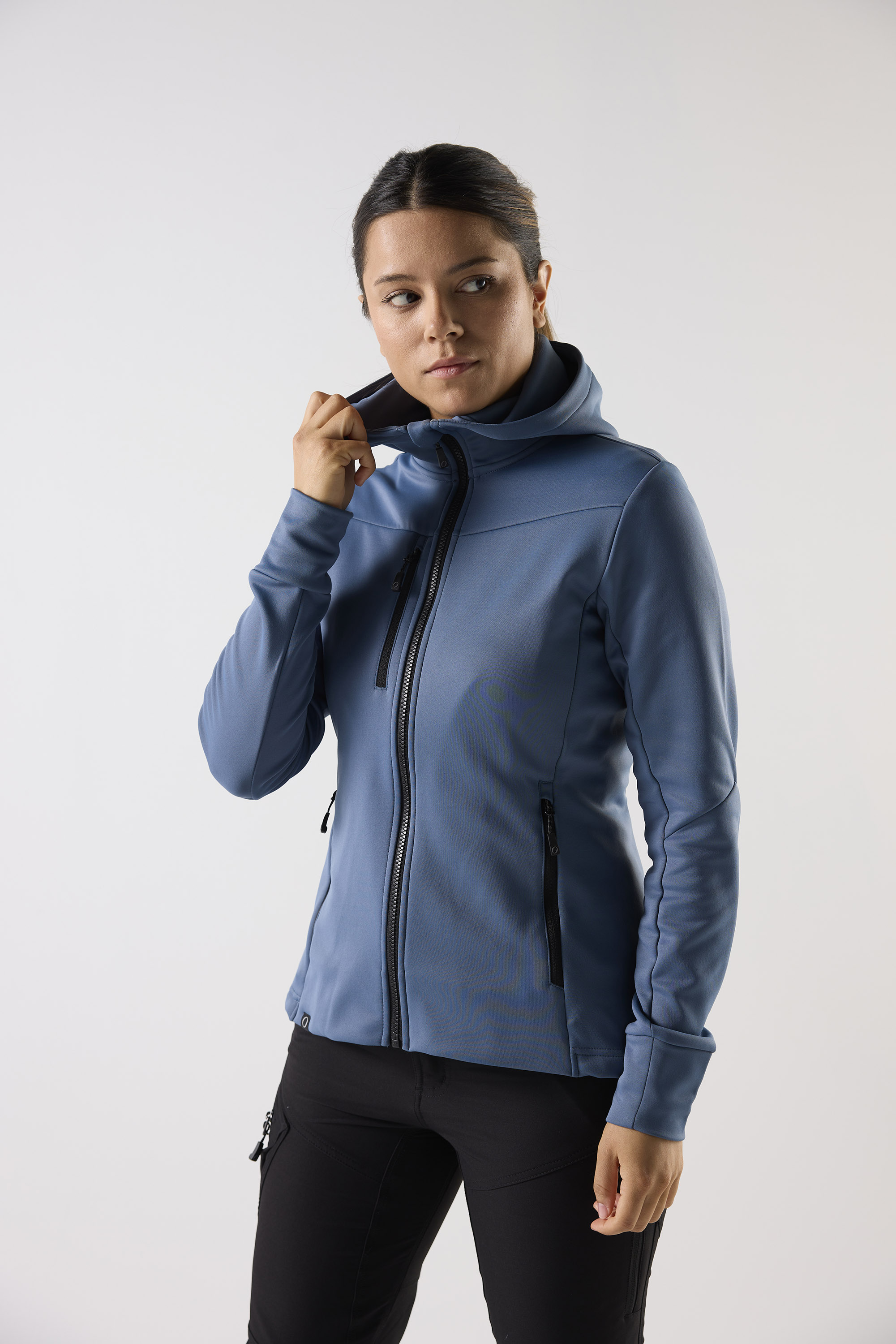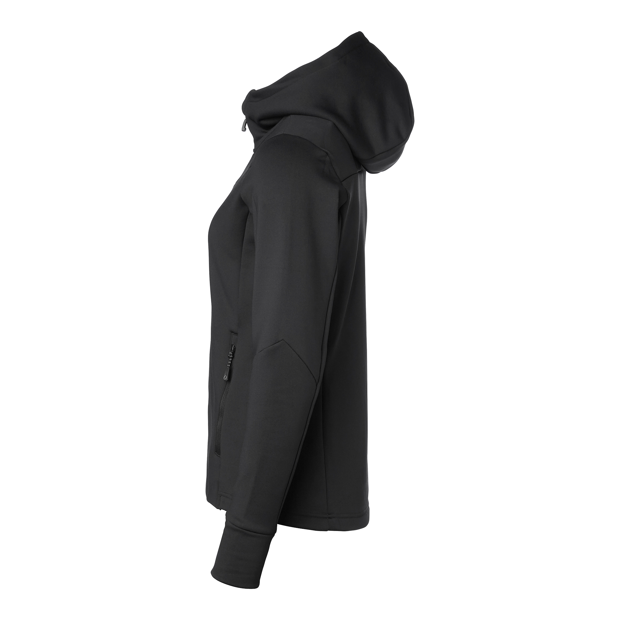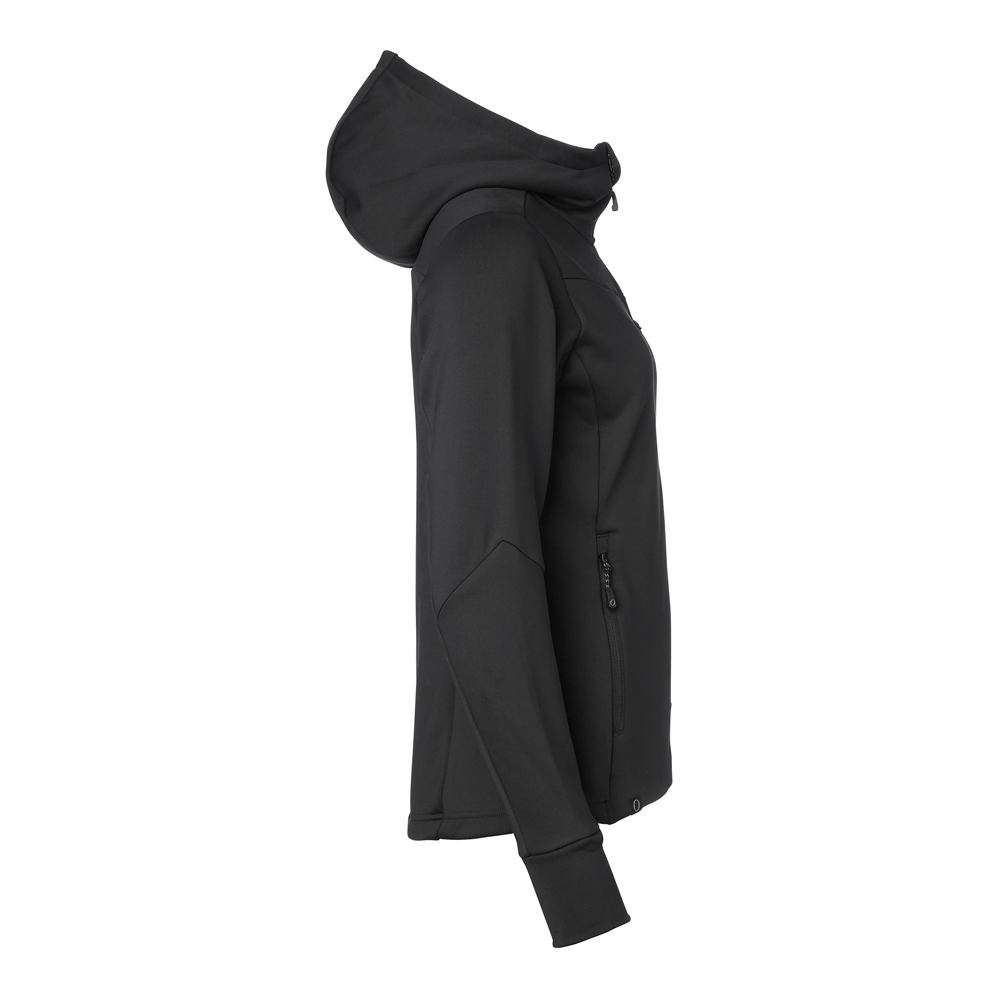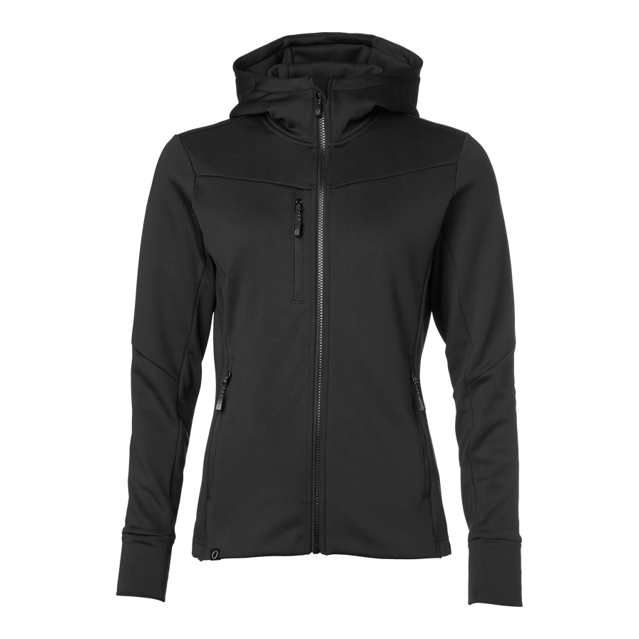 Mjuk och funktionell powerfleece med fleeceinsida. Huva med hög krage och snedställt ok. Bröstficka och två sidfickor med dragkedja. Högre muddar vid ärmslut och justerbar nederkant med elastisk dragsko.