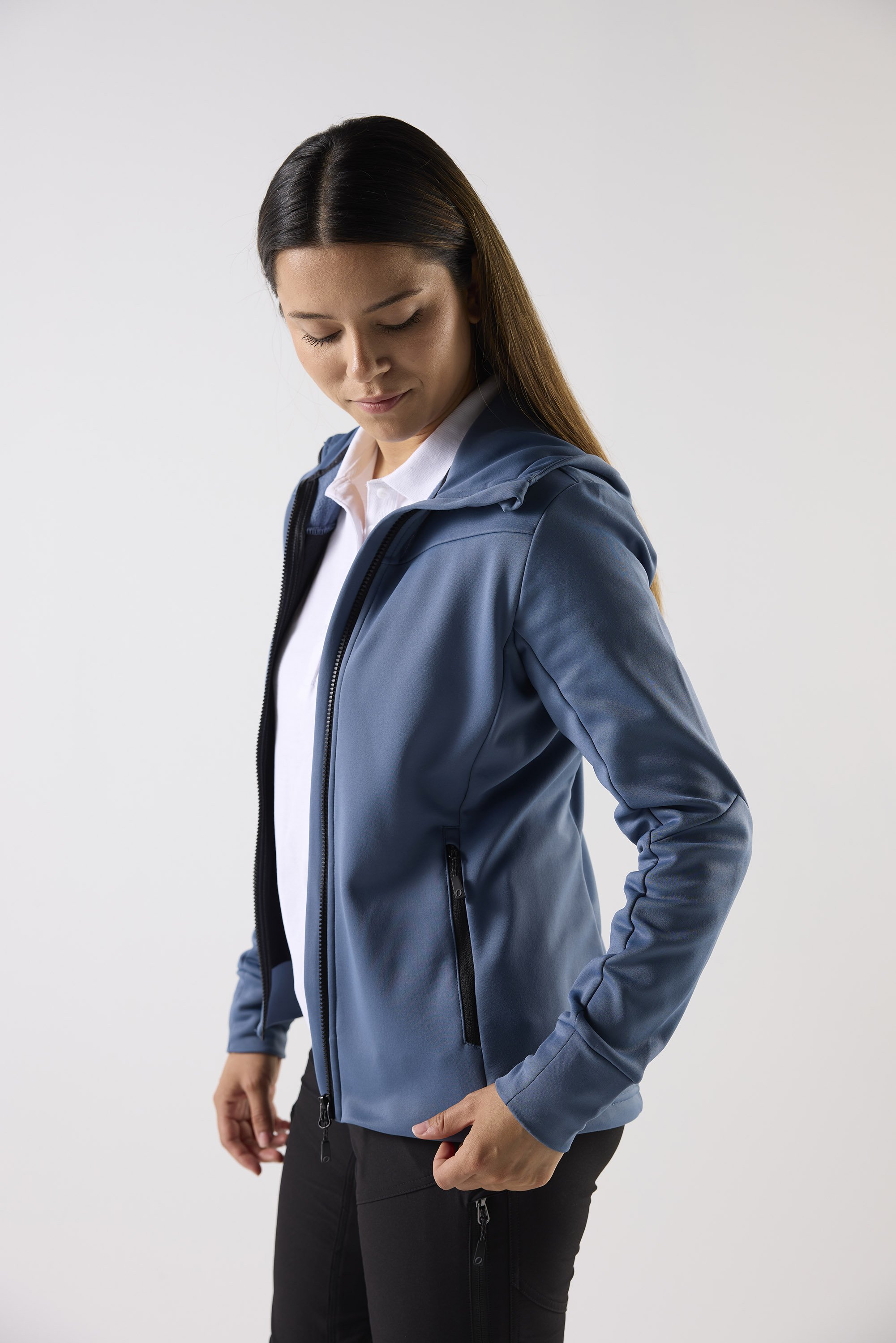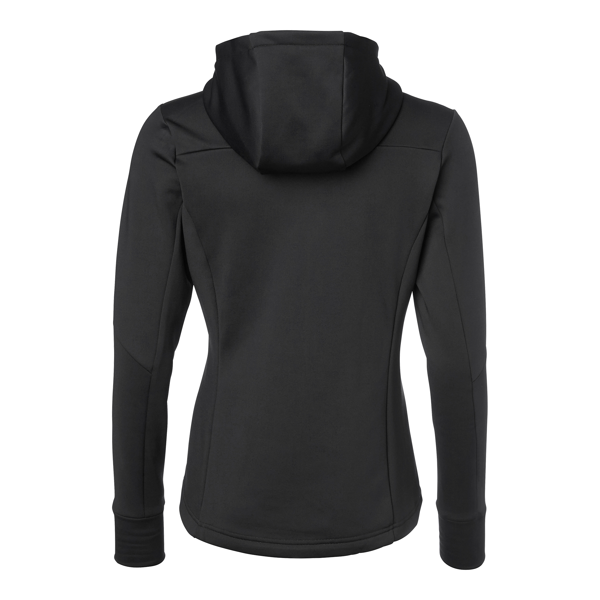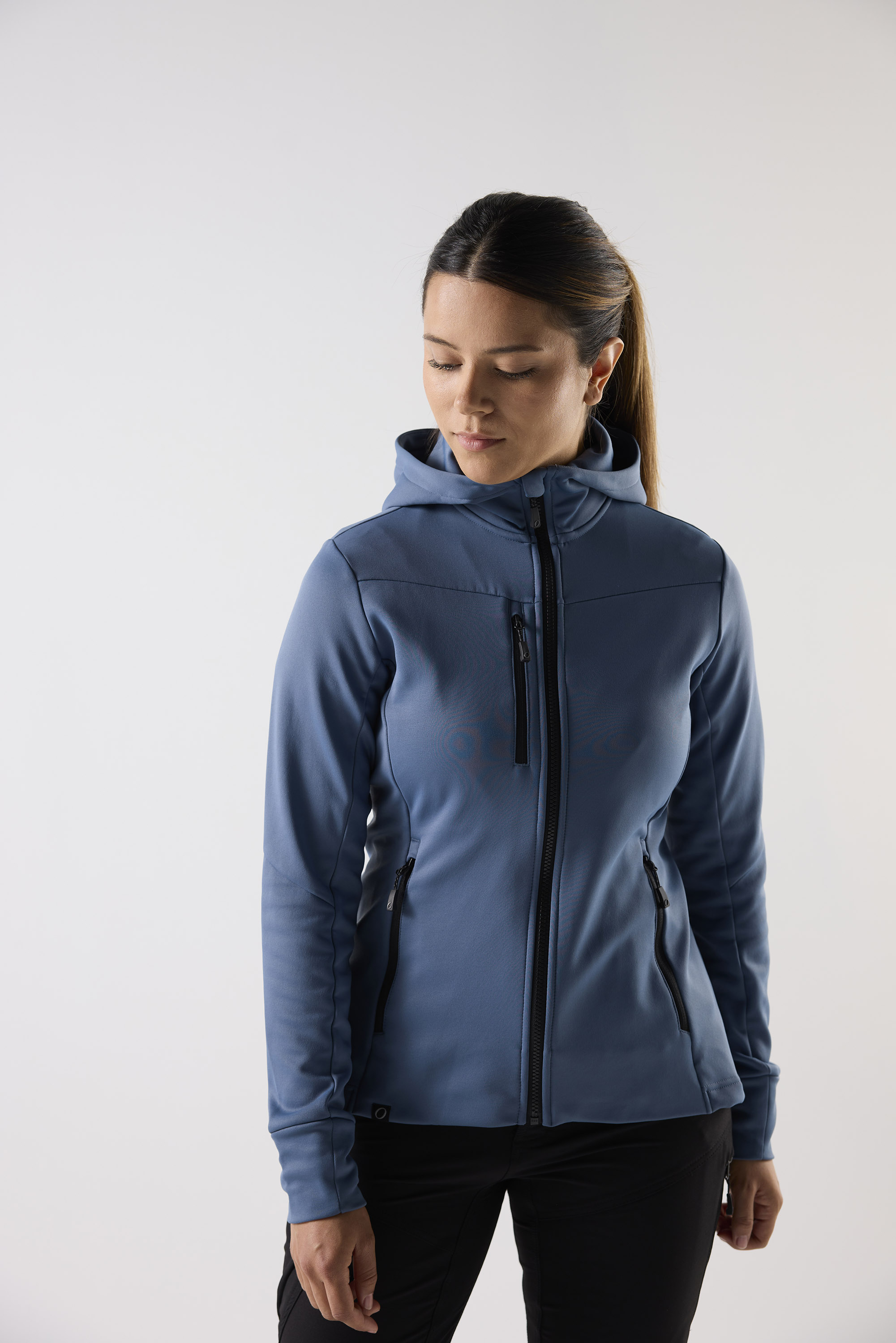Mjuk och funktionell powerfleece med fleeceinsida. Huva med hög krage och snedställt ok. Bröstficka och två sidfickor med dragkedja. Högre muddar vid ärmslut och justerbar nederkant med elastisk dragsko.