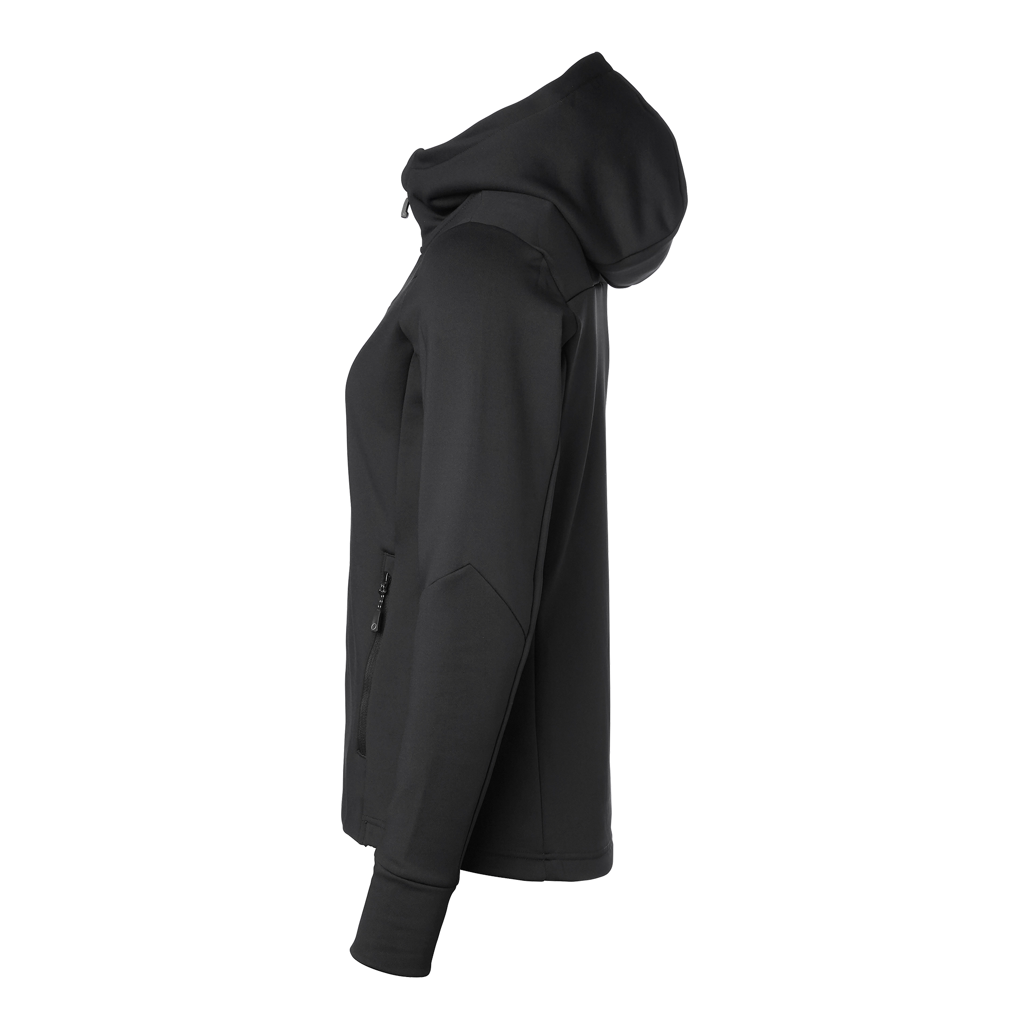 Mjuk och funktionell powerfleece med fleeceinsida. Huva med hög krage och snedställt ok. Bröstficka och två sidfickor med dragkedja. Högre muddar vid ärmslut och justerbar nederkant med elastisk dragsko.