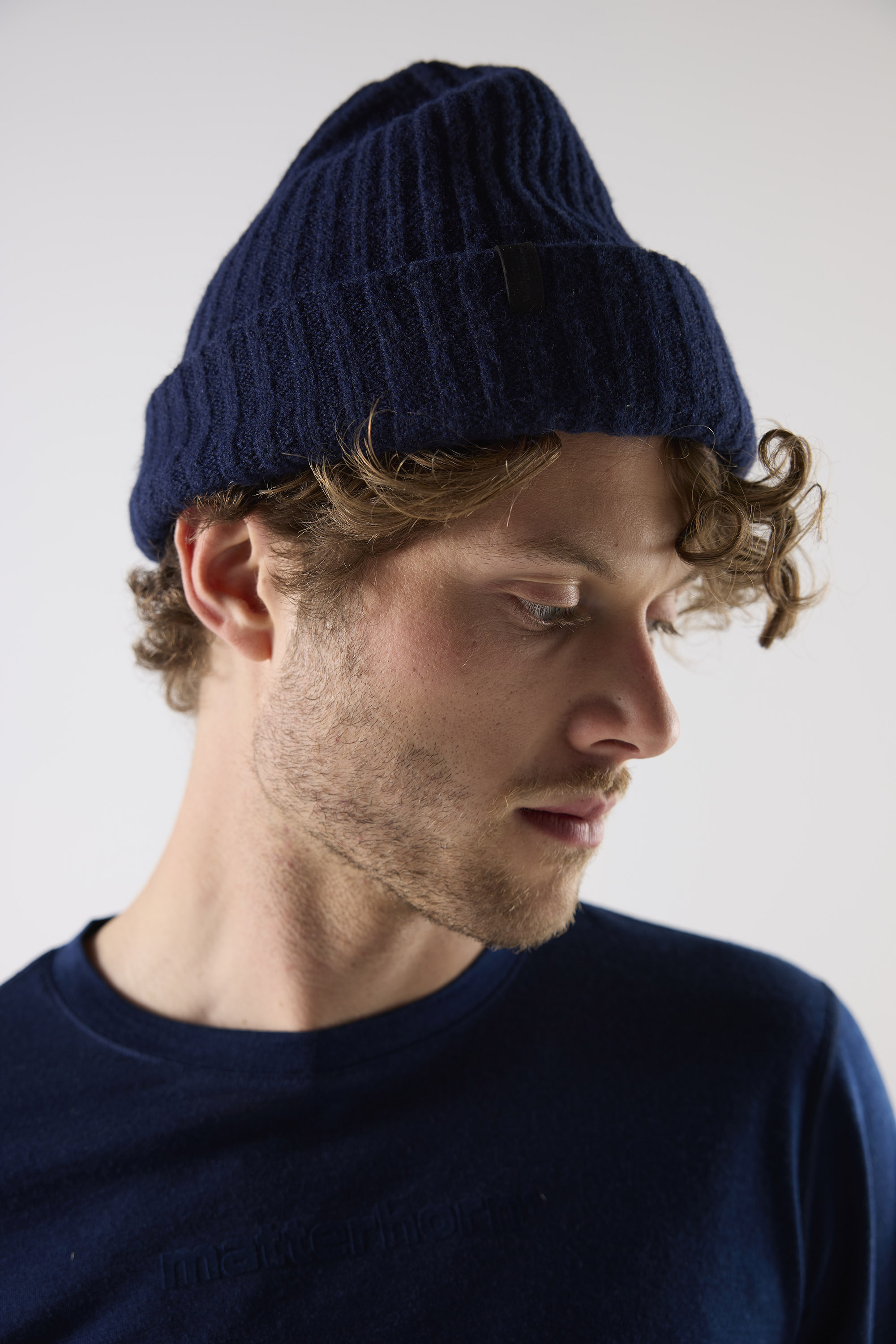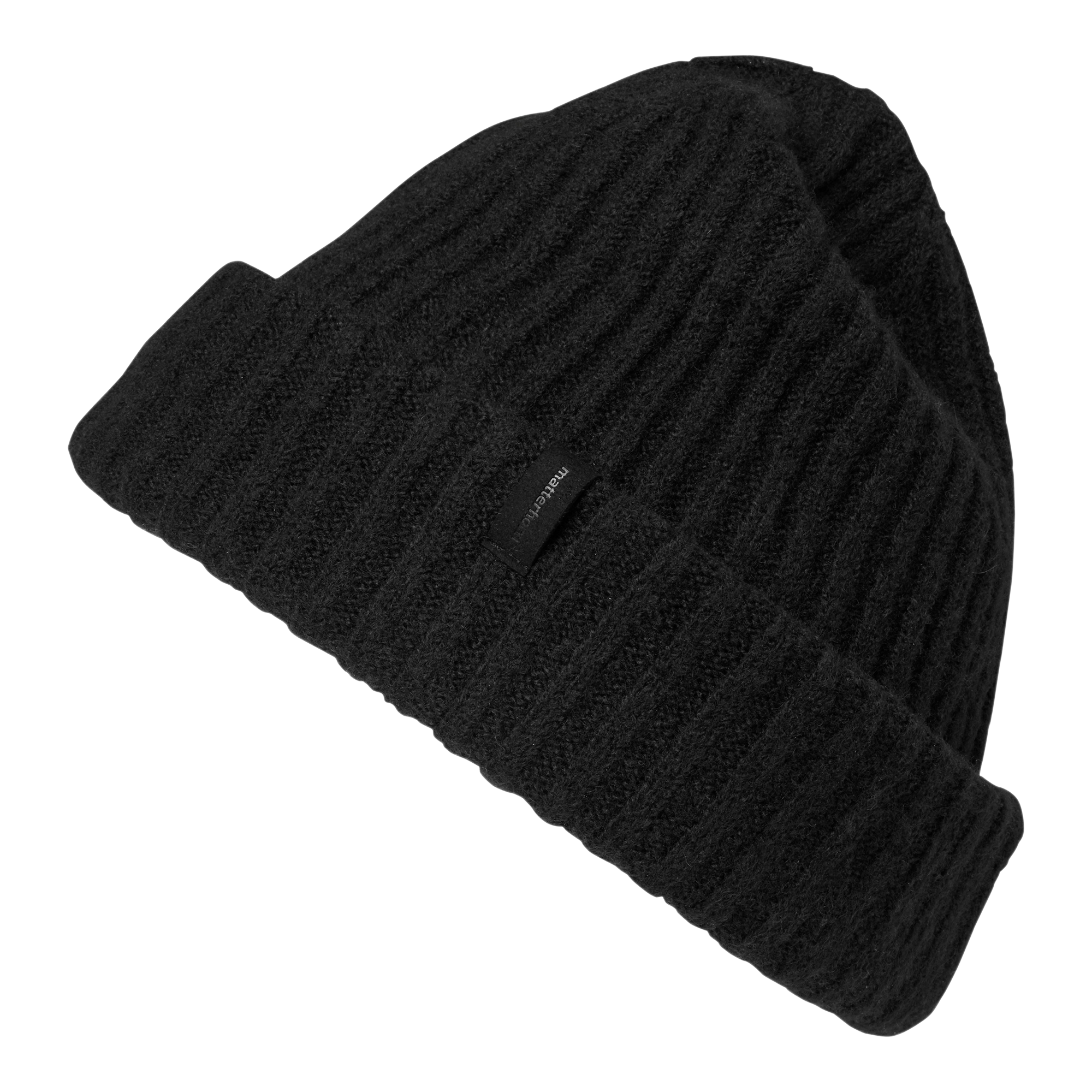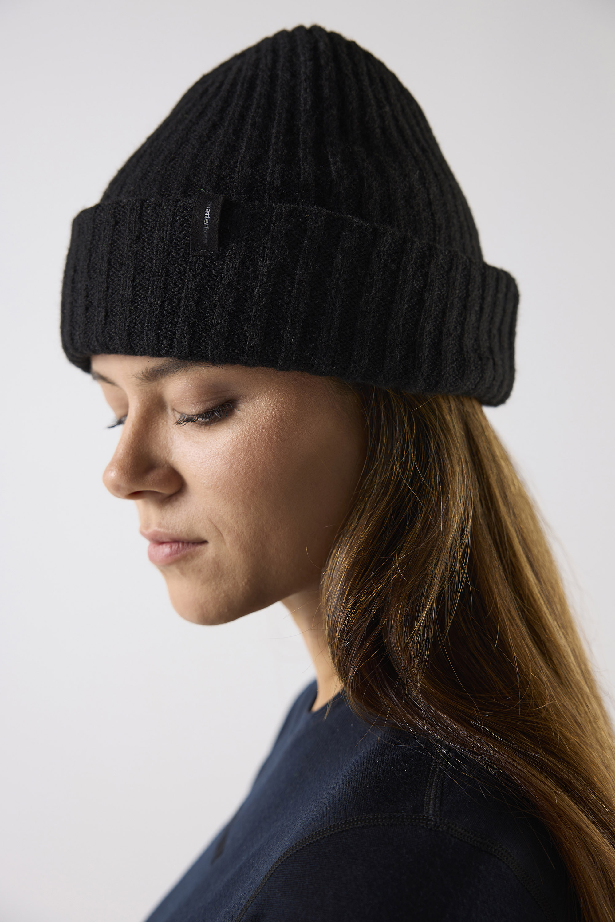Grovstickad unisexmössa i ullblandning med bred uppvikt kant. Återvunnen polyester ger ett medvetet materialval med struktur, värme och stretch. Klassisk ribbstickning med rundad form. Finns i svart och mörkblå.