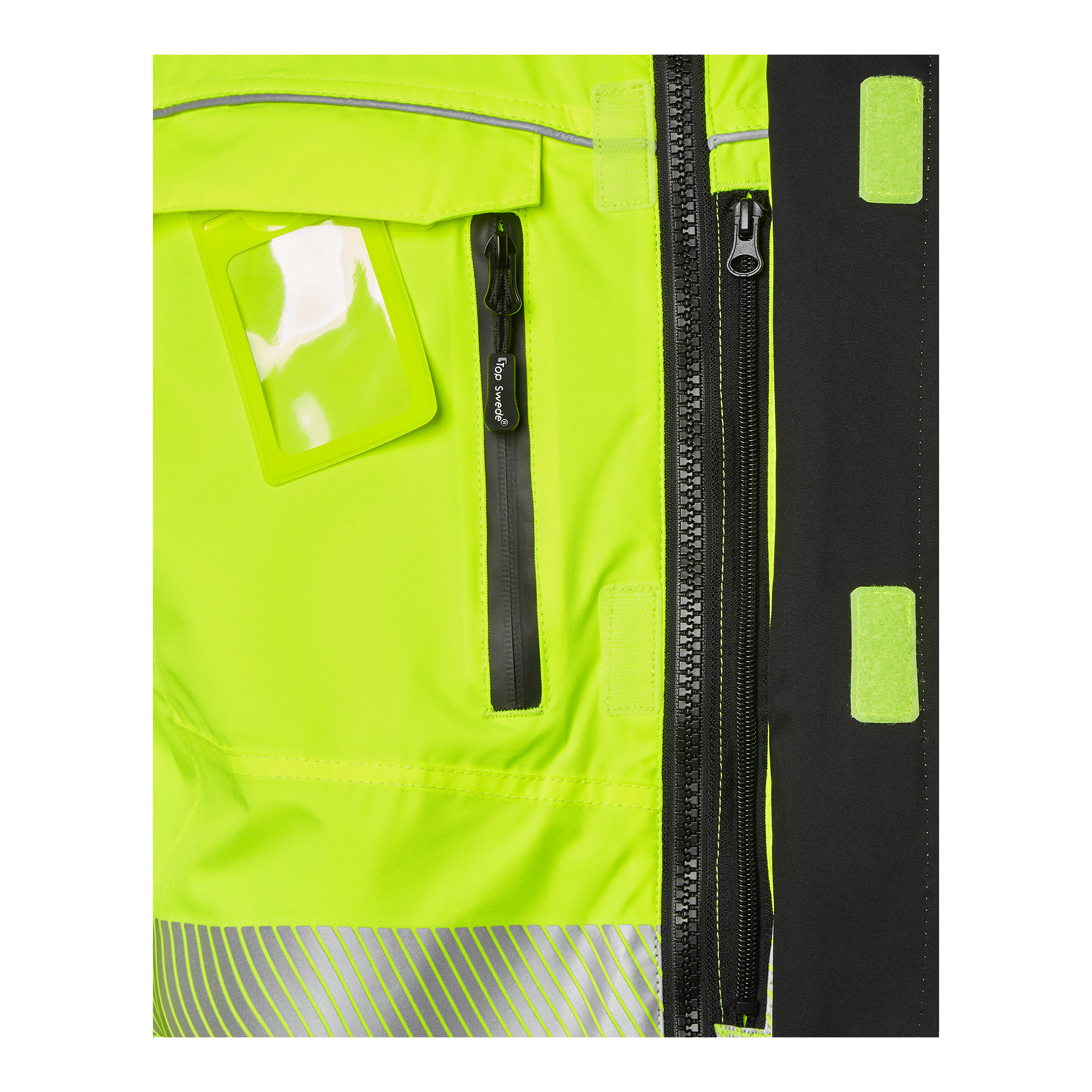 Upptäck Top Swedes 130 Jacket, en vind- och vattentät skaljacka designad för optimal komfort och funktionalitet, idealisk för yrkesverksamma inom bygg och industri. Denna jacka har tejpade sömmar och erbjuder en enastående andasfunktion, vilket säkerställer att du håller dig torr och bekväm under hela arbetsdagen. Yttertyget är stretchigt för maximal rörelsefrihet, och dragkedjan går hela vägen upp i kragen för extra skydd. Jackan är utrustad med två bröstfickor med lock, varav den högra har en ID-kortsficka, samt två bröstfickor med vattentäta dragkedjor. En stor kartficka innanför slå, två framfickor och två innerfickor med dragkedja ger gott om förvaringsutrymme. Mudd i ärmslut med tumgrepp, reglerbart ärmslut med kardborre och dragsko i nederkant säkerställer en perfekt passform. Den avtagbara och reglerbara huvan ger ytterligare flexibilitet och skydd mot väder och vind. Top Swede är känt för sin höga kvalitet och denna jacka är inget undantag. 130 Jacket är designad för att möta de höga kraven från yrkesverksamma som behöver pålitliga och funktionella arbetskläder. Välj Top Swede för arbetskläder som du kan lita på, oavsett arbetsmiljö.