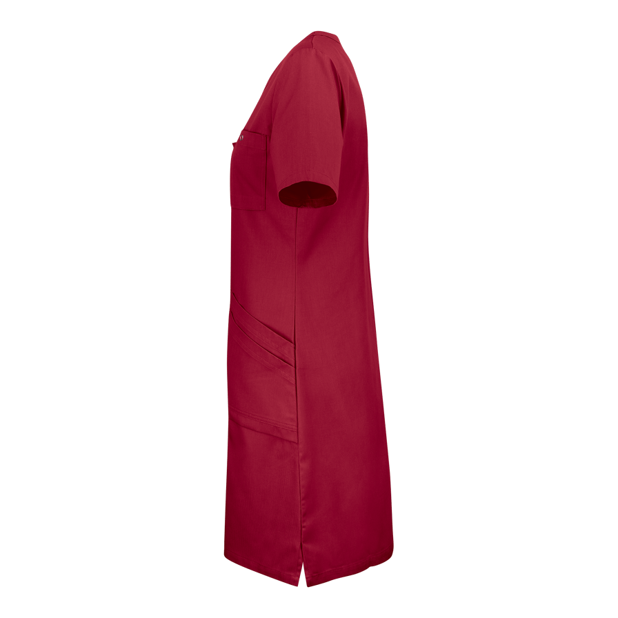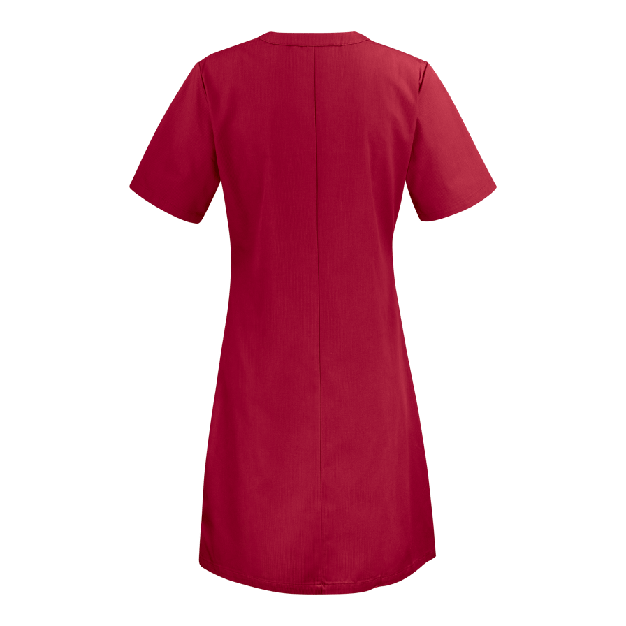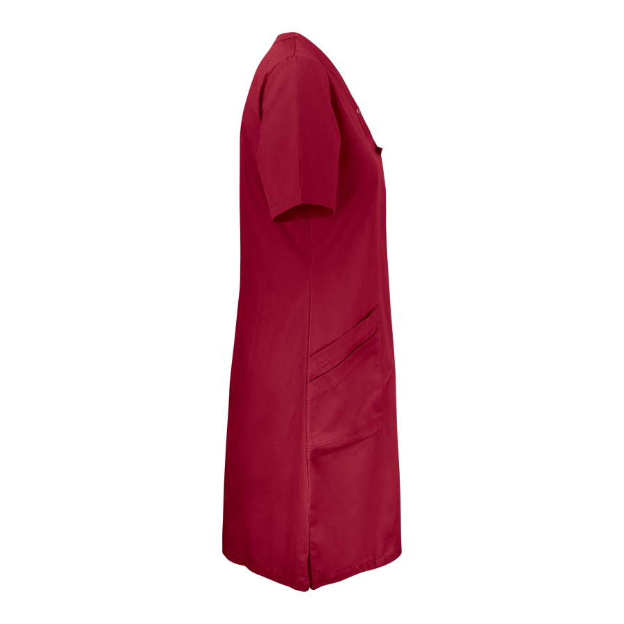 Lätt insvängd klänning med V-ringning och ringknapp. Utrustad med dubbla snedställda framfickor inklusive nyckel/korthållare samt bröstficka.