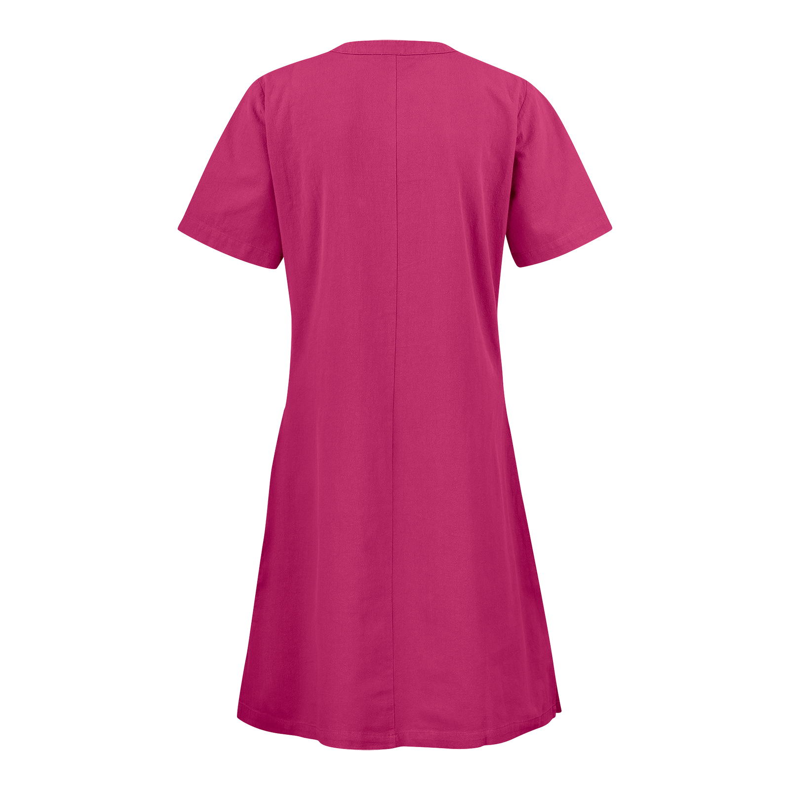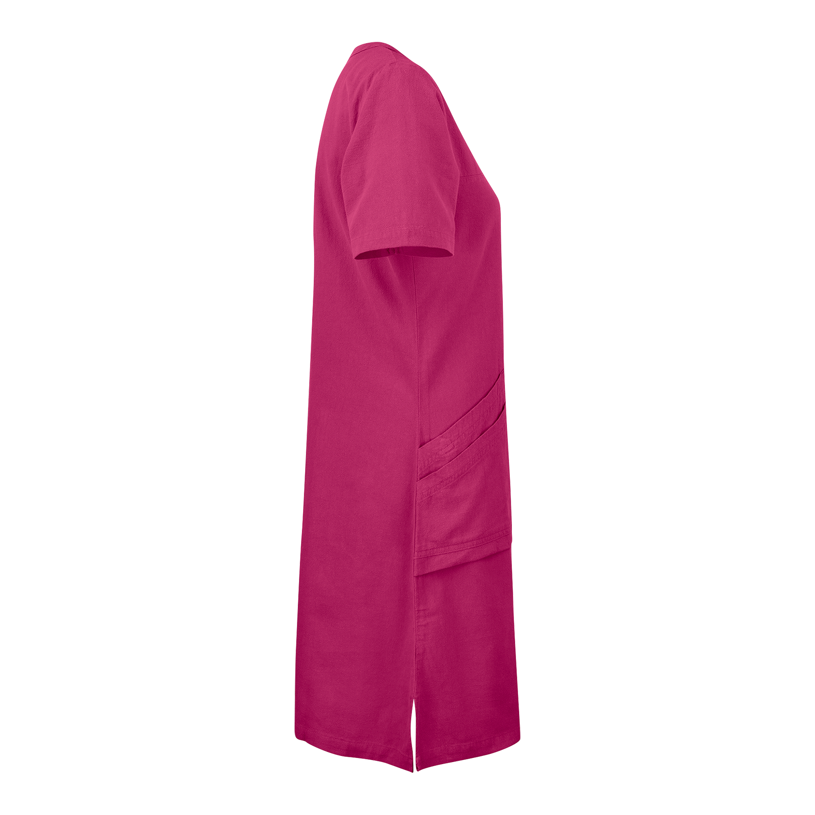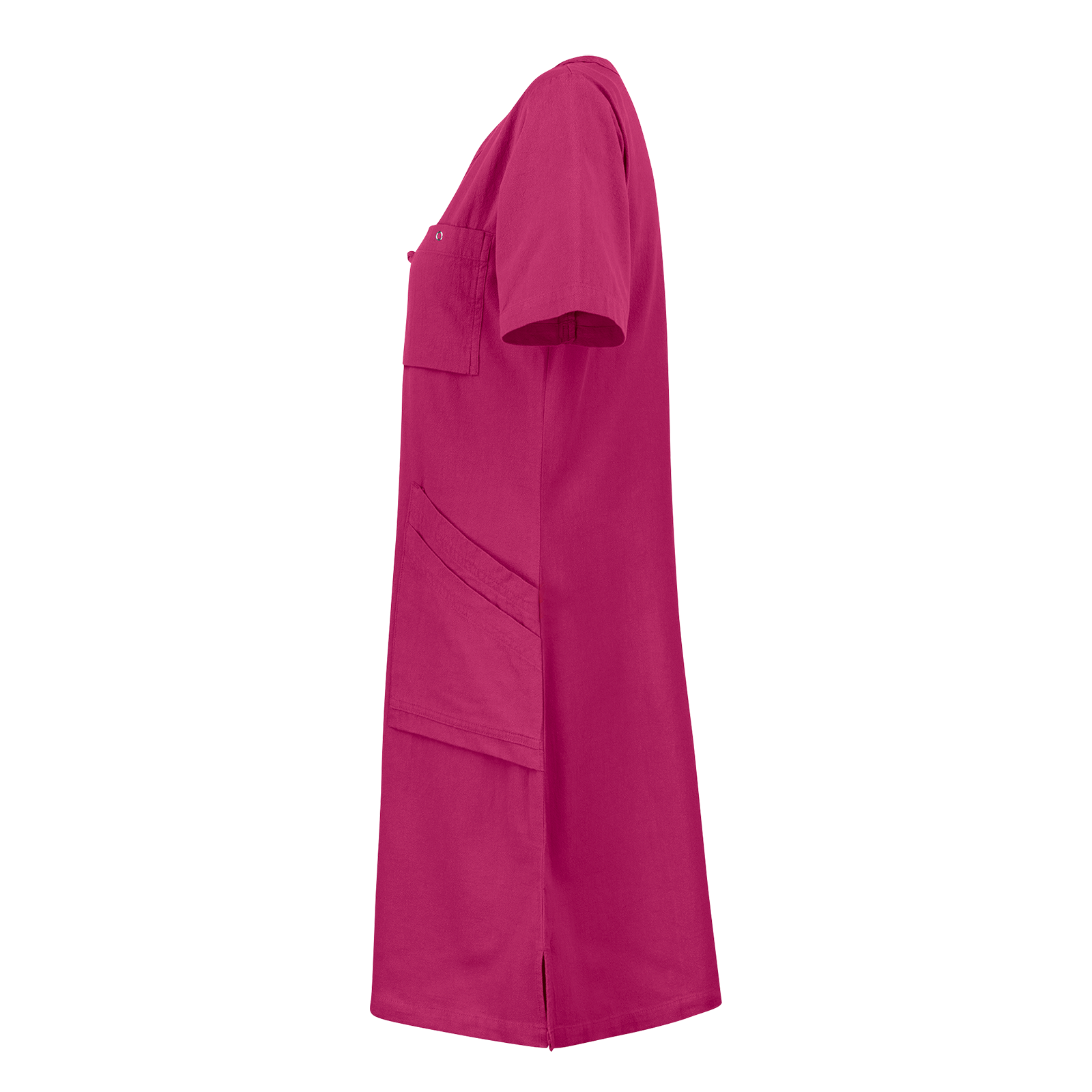 Lätt insvängd klänning med V-ringning. Utrustad med rymliga framfickor inklusive nyckelhållare och mobilficka samt bröstficka med ringtryckknapp och korthållare. Slits i sidan. Krinklad bomull.