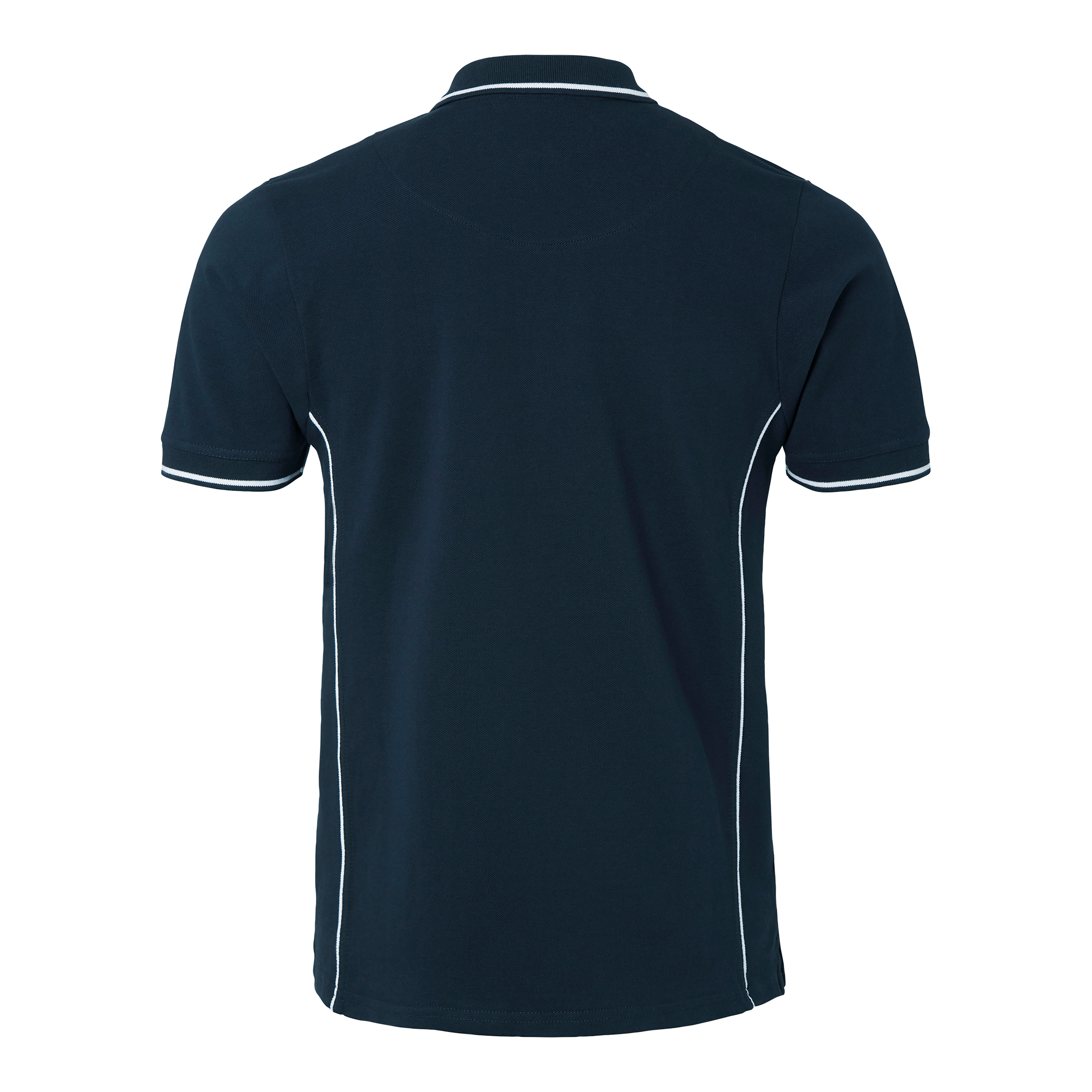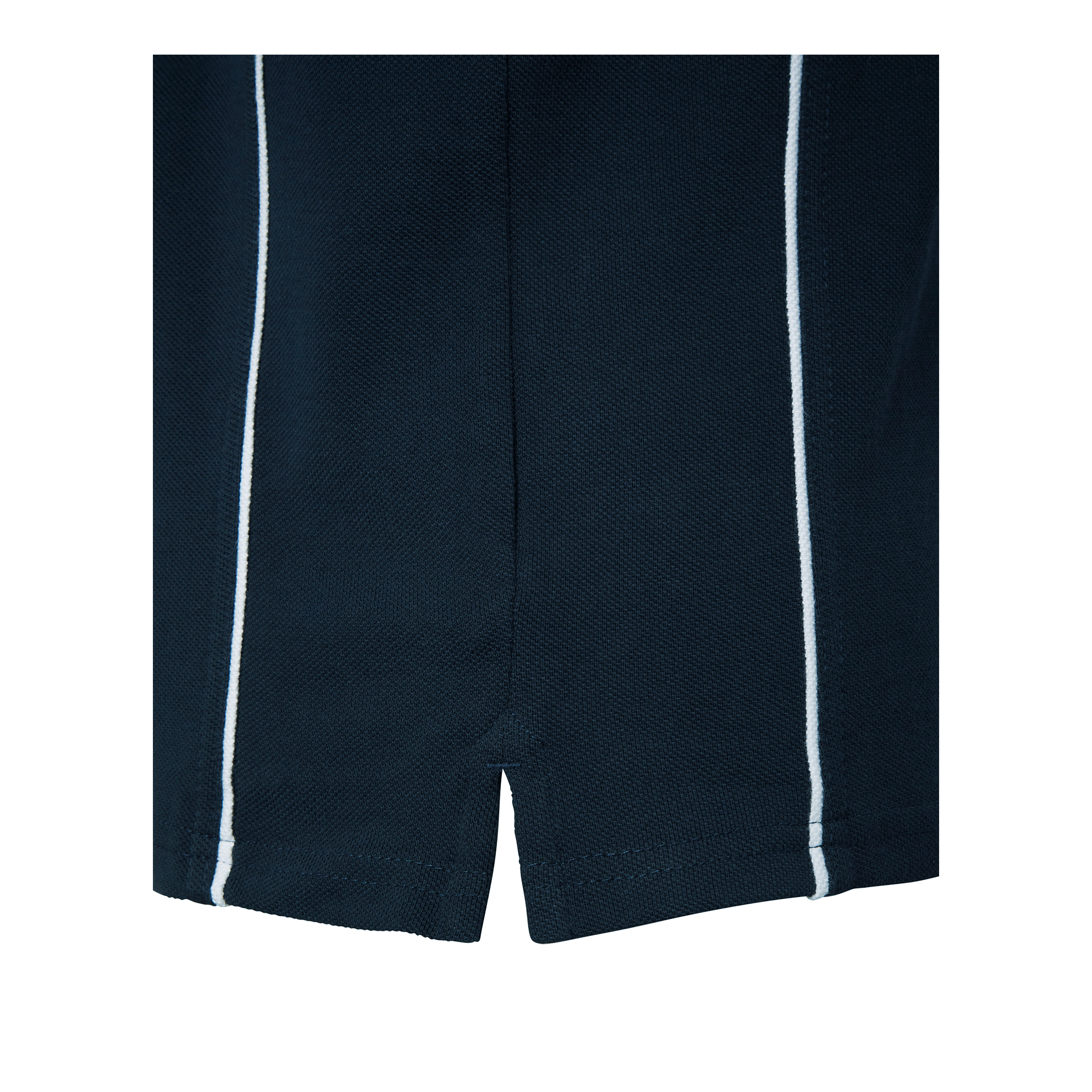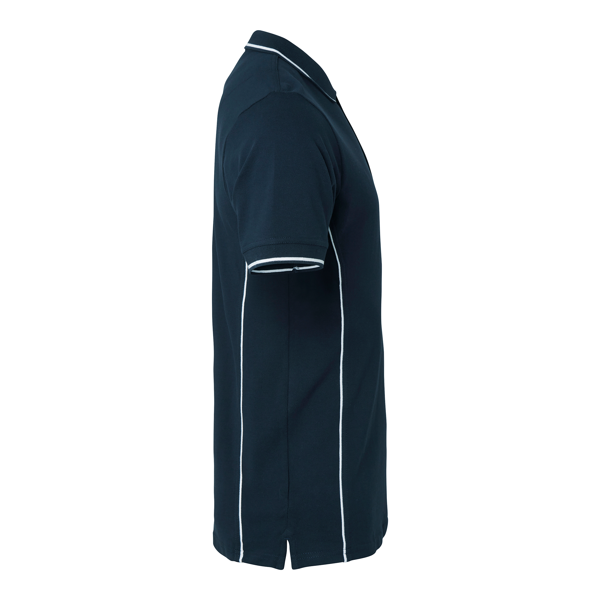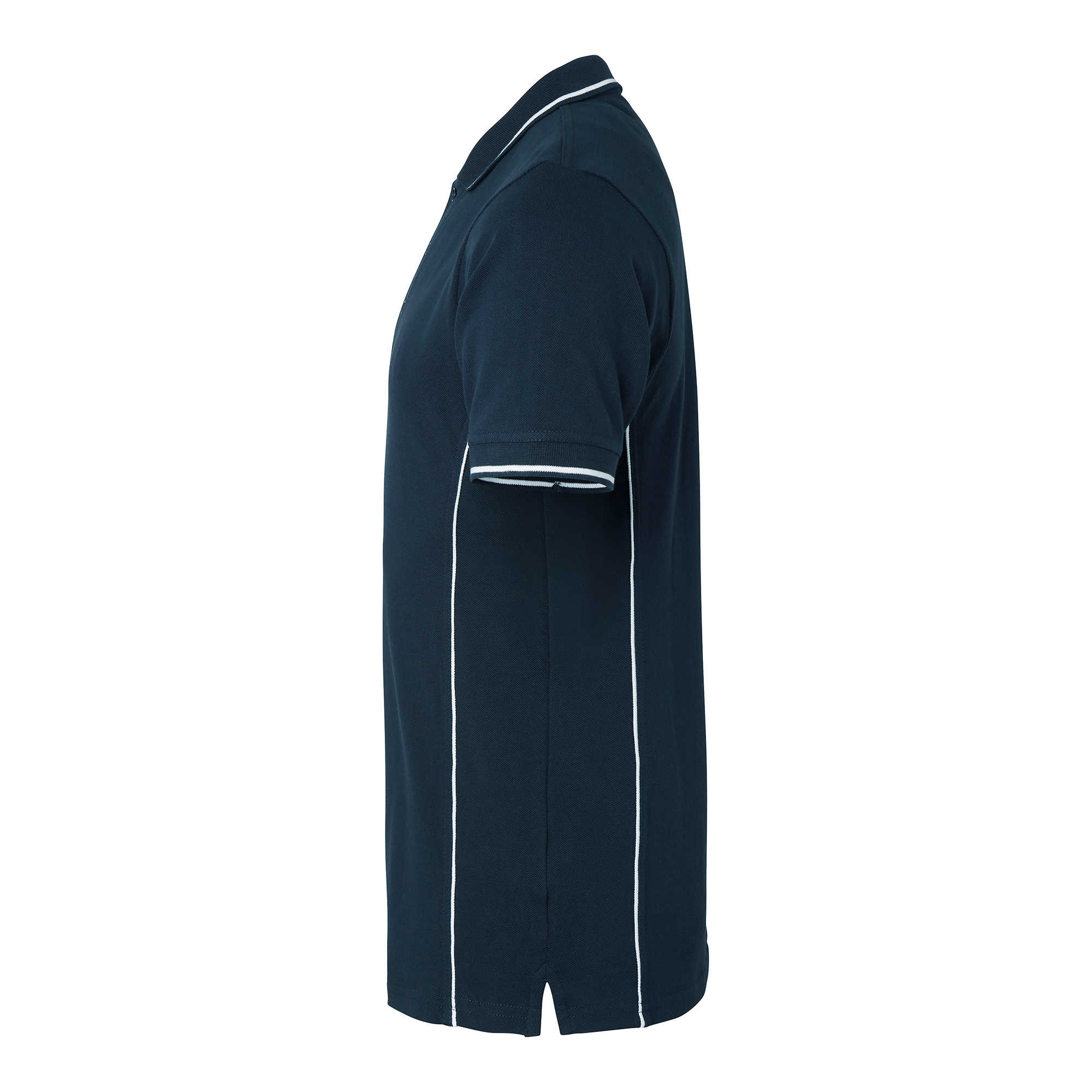 Piké i bomull med ribbstickad krage och kontrastpiping. Har sprund i sidorna för extra komfort. Perfekt för en stilren och bekväm arbetsdag.