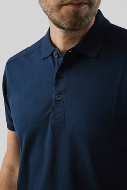 GOTS-certifierad piké i ekologisk Fairtrade-bomull och elastan med modern passform. Knappar av återvunna knapprester, med flatlockstickningar och invändigt nacktryck med miljömärkning.
