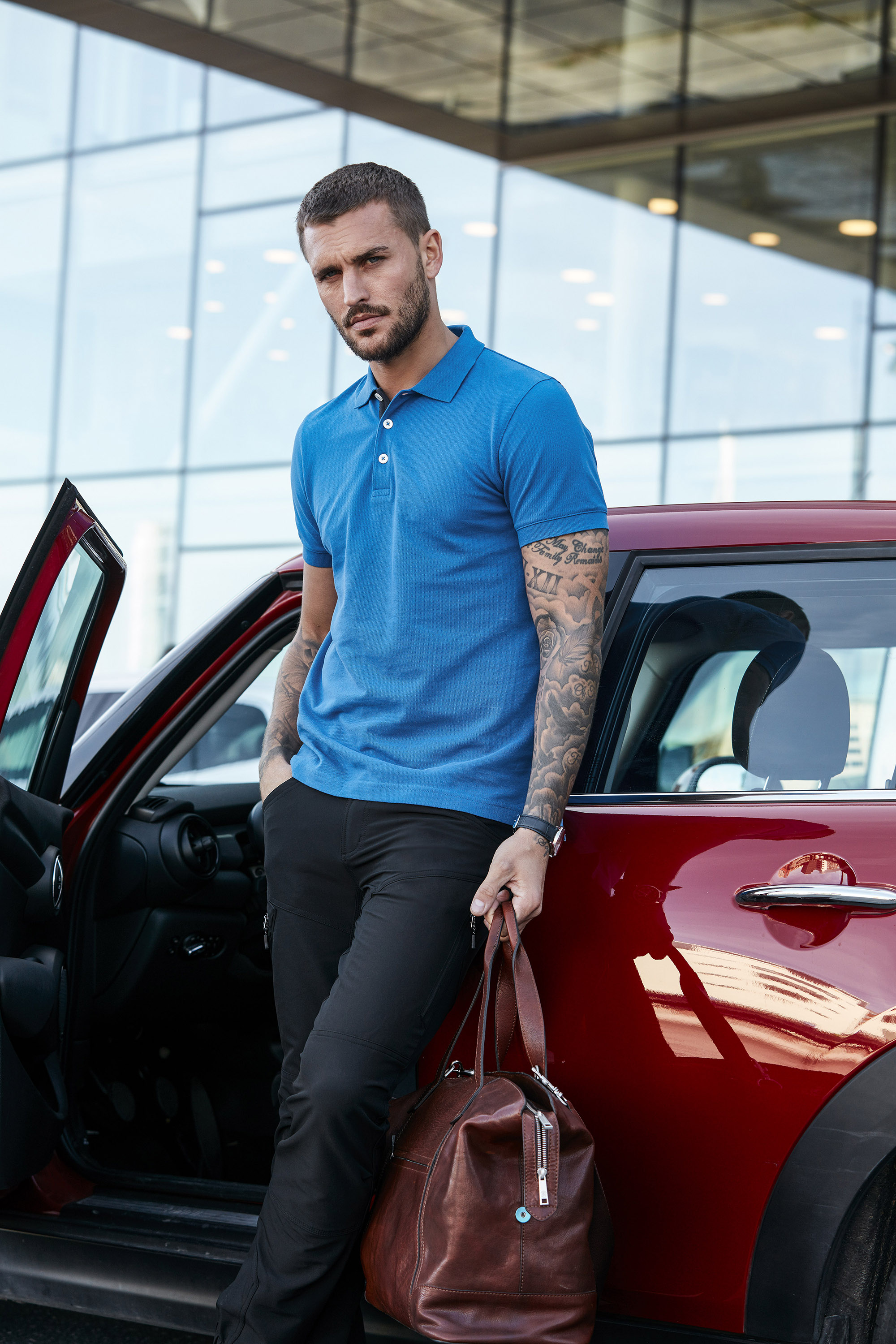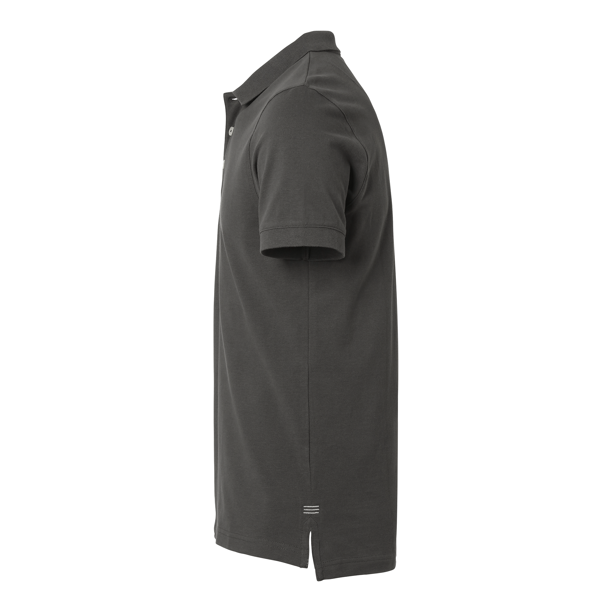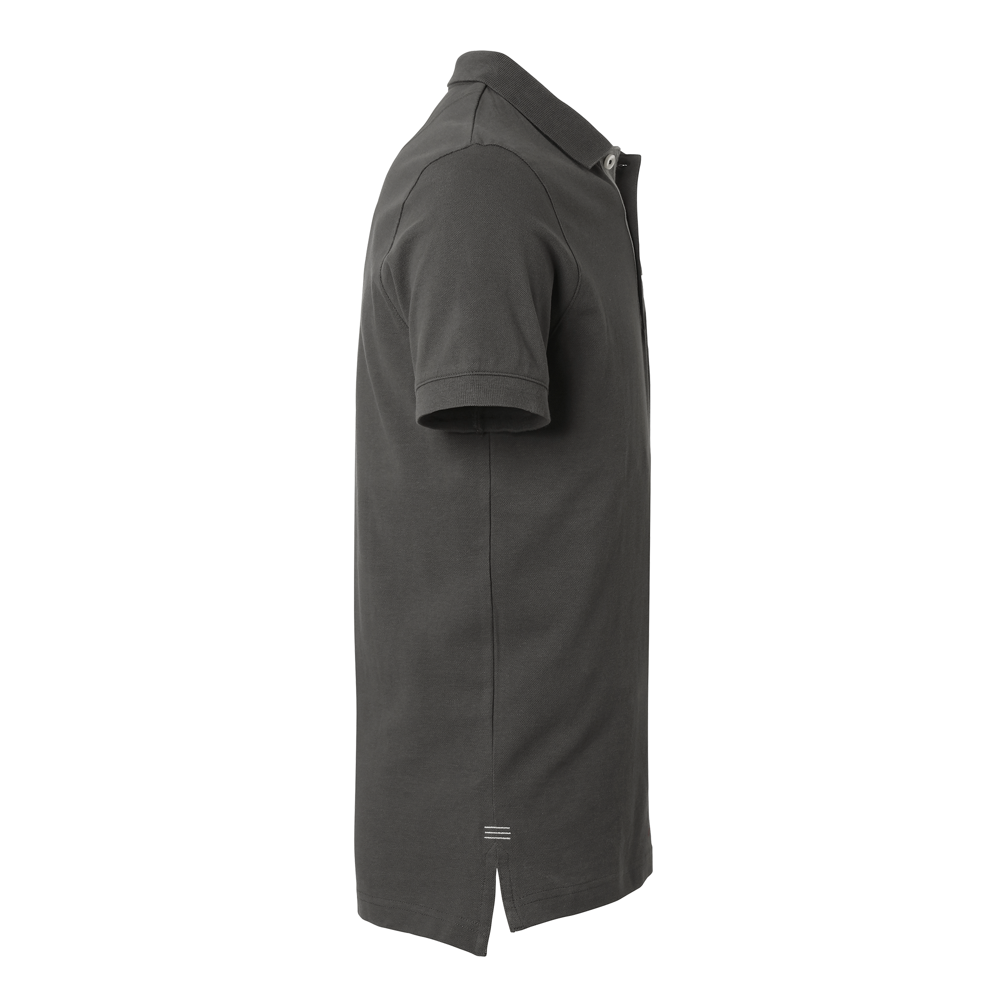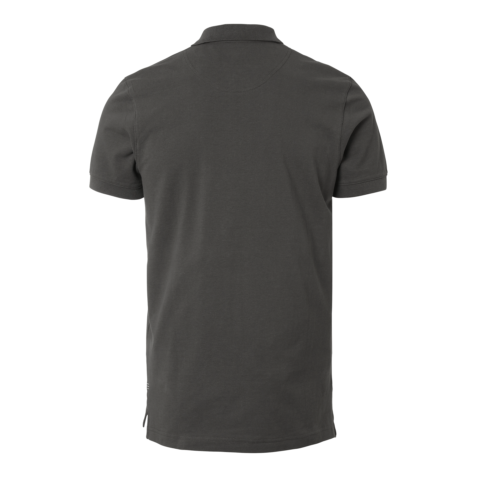 Piké i bomull med dekorativt band och halvmånesöm i nacken. Knappslå med vita knappar och fiskbensmönstrad insida i avvikande färg. Ton-i-ton brodyr för en diskret, stilren look.