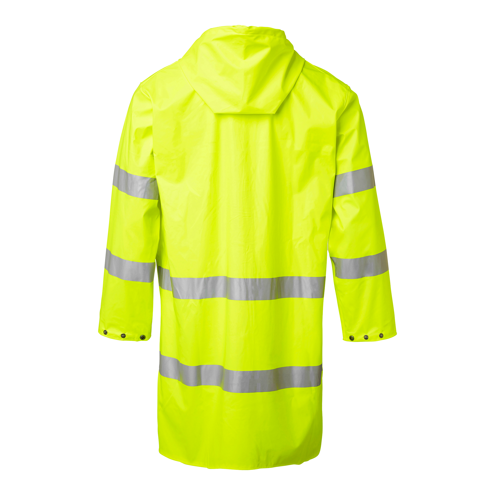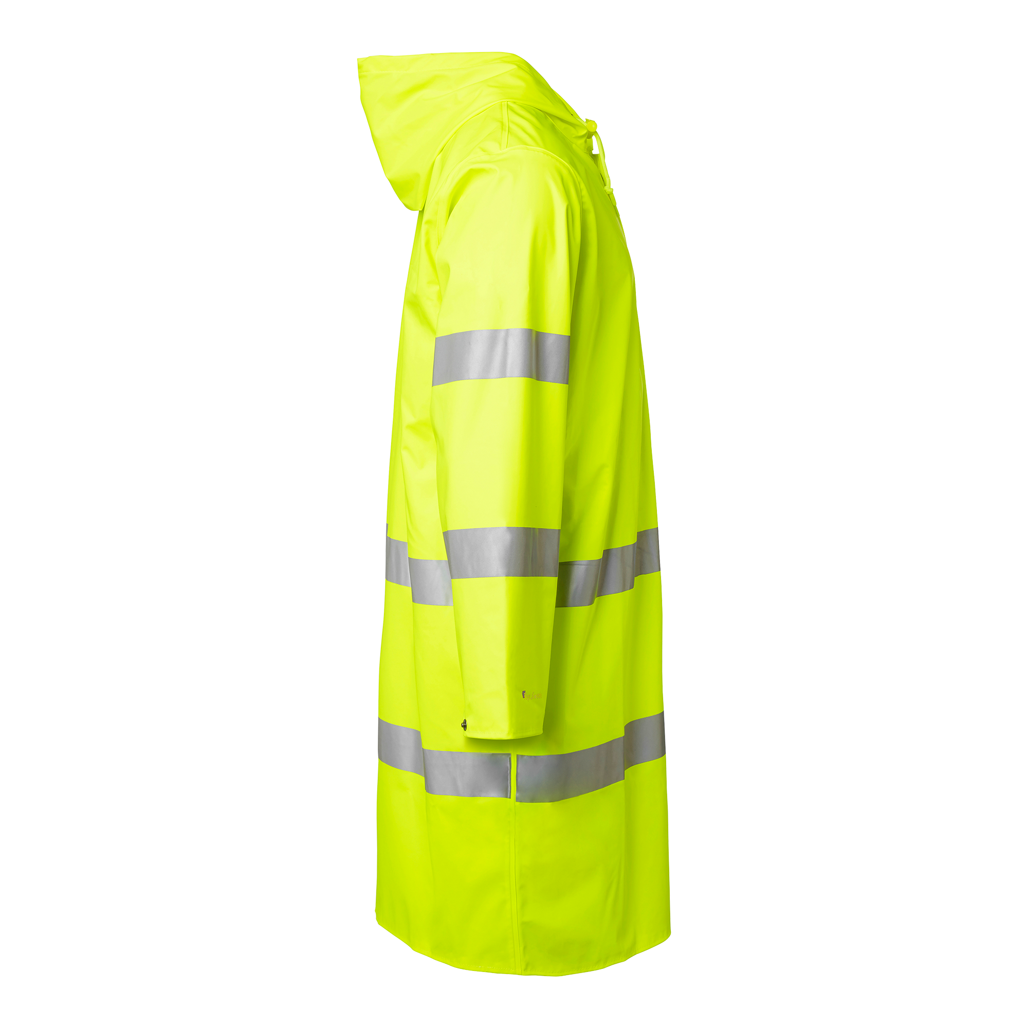 Varselregnrock 100 cm i smidigt stretchmaterial med svetsade sömmar. Blixtlås med slå och tryckknappar, huva med snodd, och reglerbart ärmslut för optimal passform och synlighet i regniga förhållanden.