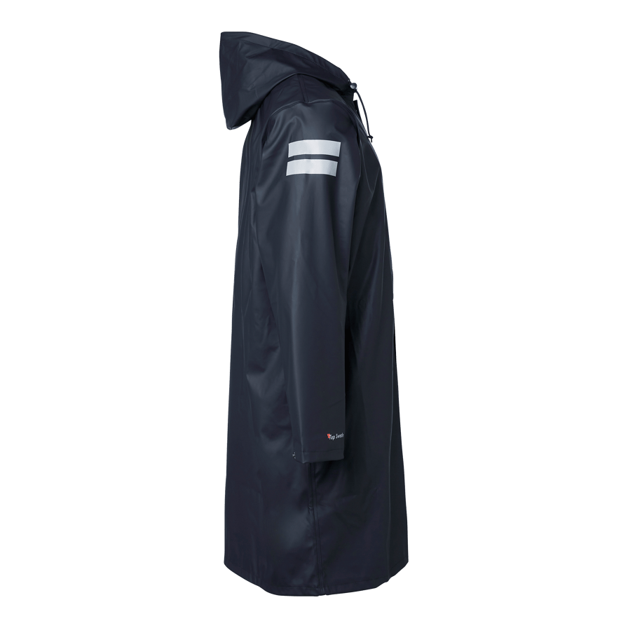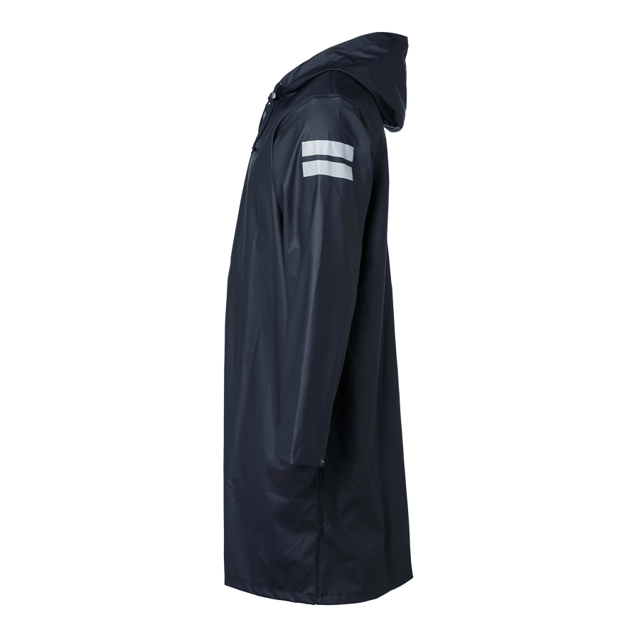 Regnrock 100 cm i smidigt stretchmaterial med svetsade sömmar. Blixtlås med slå och tryckknappar, huva med snodd, och reglerbart ärmslut för optimal passform och skydd mot regn.