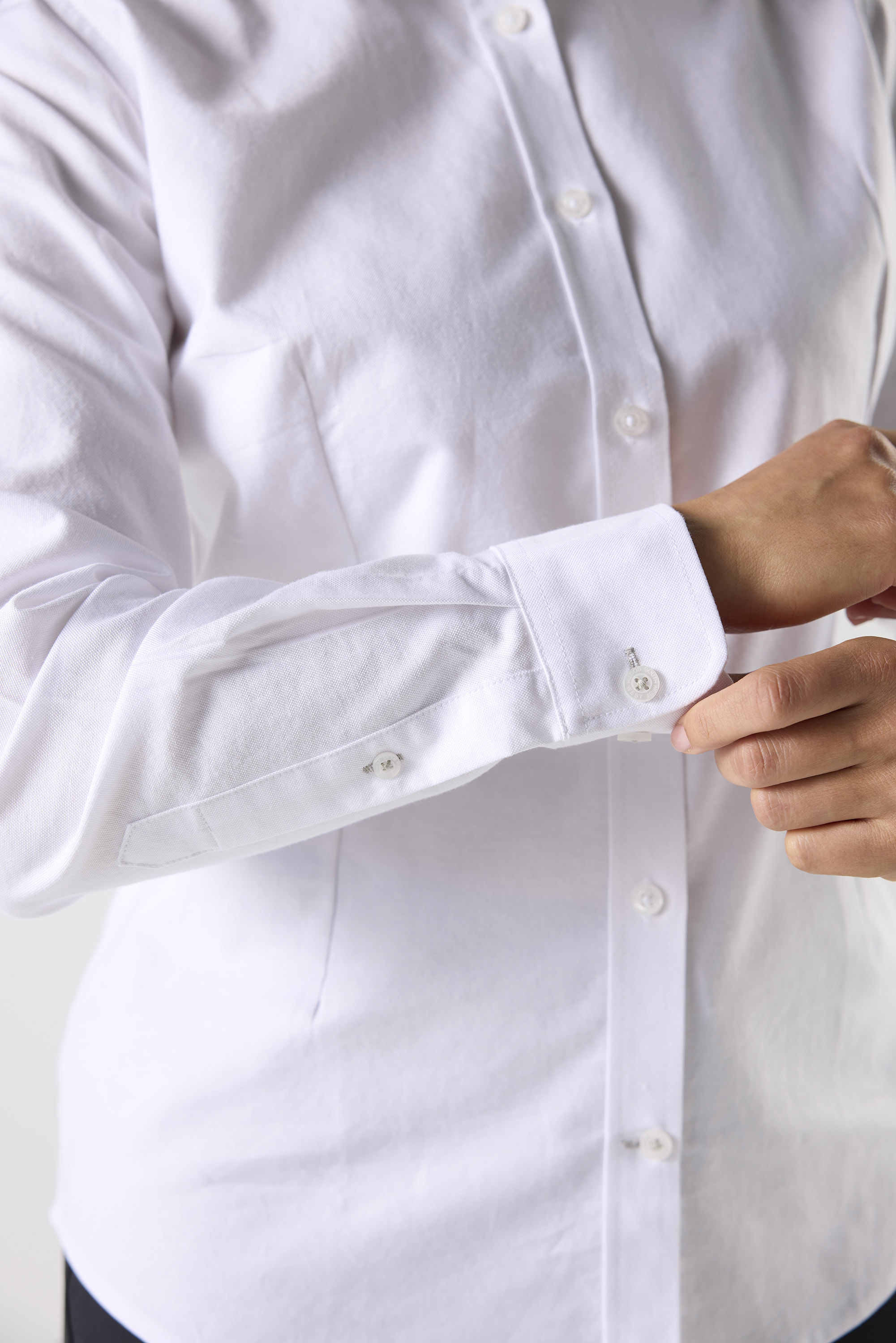 Aline är en långärmad figursydd damskjorta i 100% GOTS-certifierad bomull. Skjortan har turn down-krage och knäppning framtill. Modellen har en lätt rundad fåll och är något längre baktill. Passar perfekt till vardags, jobb eller mer festliga tillfällen.