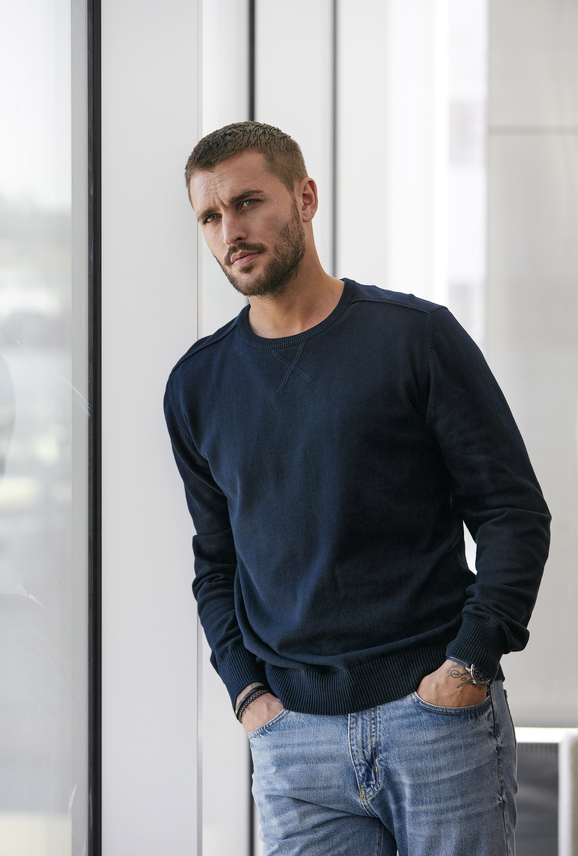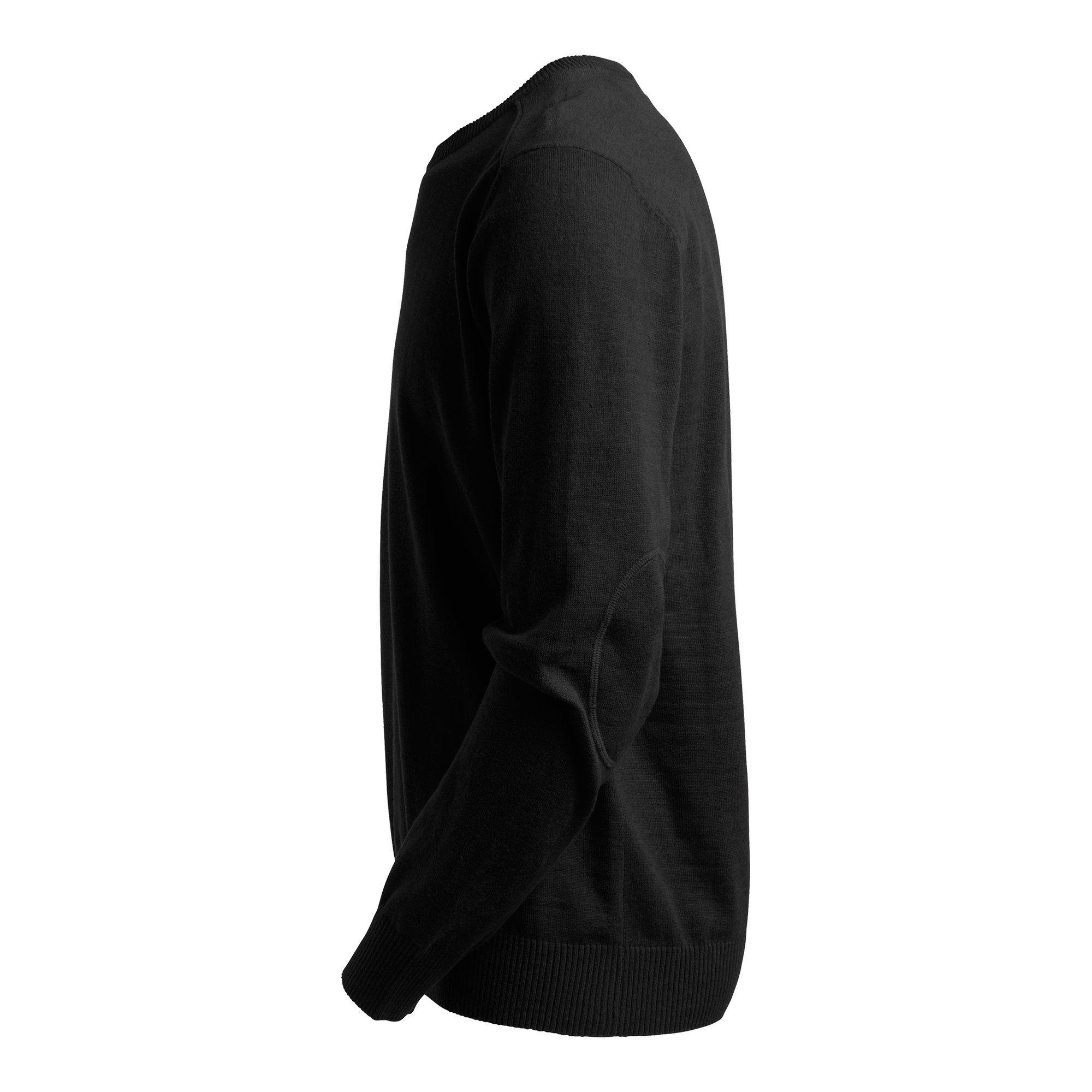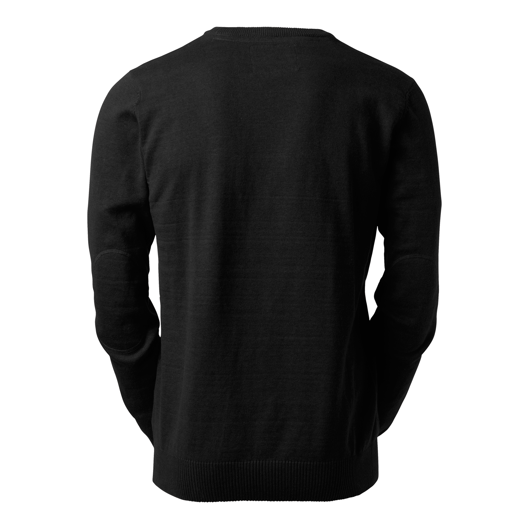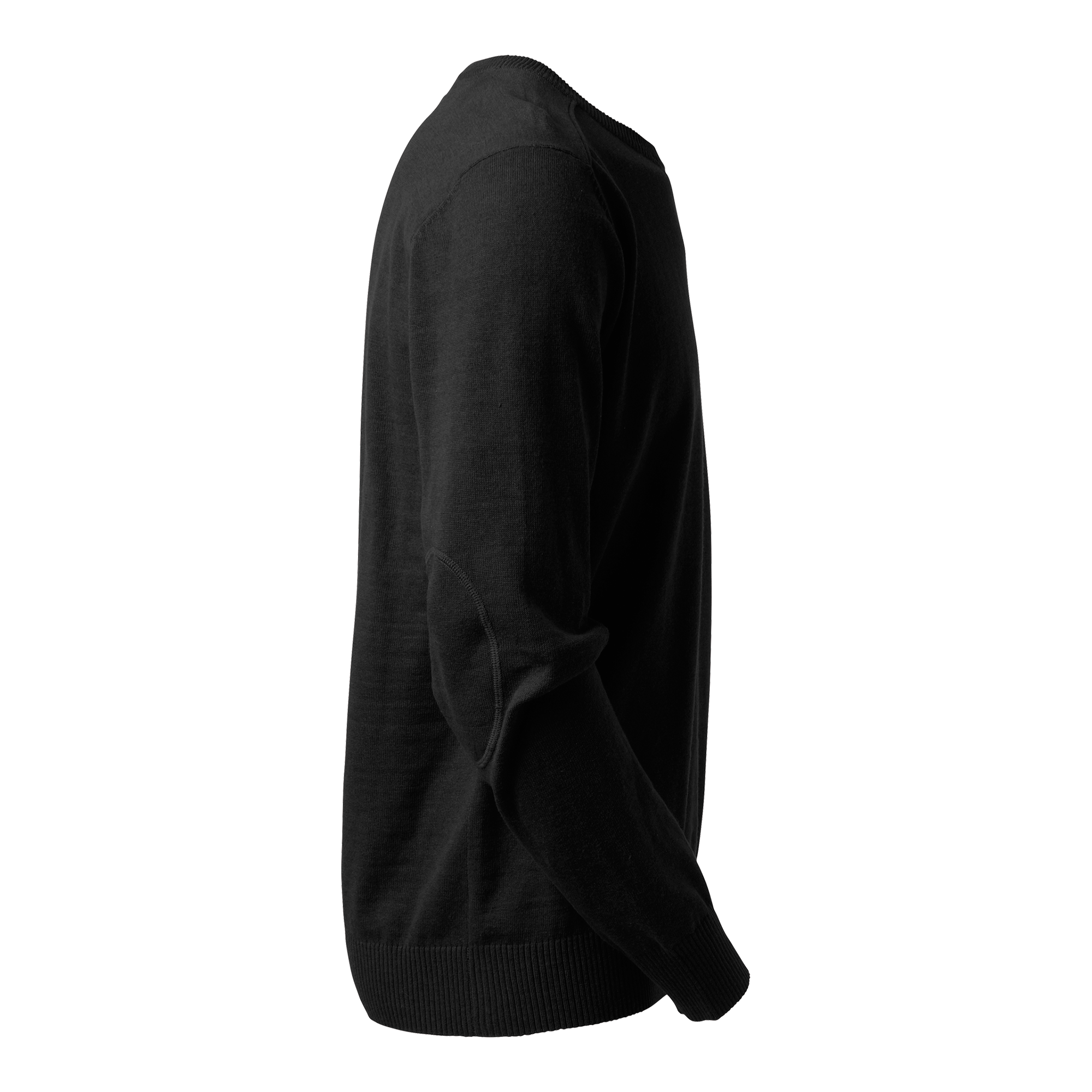 Finstickad, rundhalsad tröja med ribbad ringning och dekorativa flatlockstickningar vid halsringningen. Armbågspatchar med kontraststickning och tab i läderimitation i nederkant. Perfekt för både arbete och fritid.