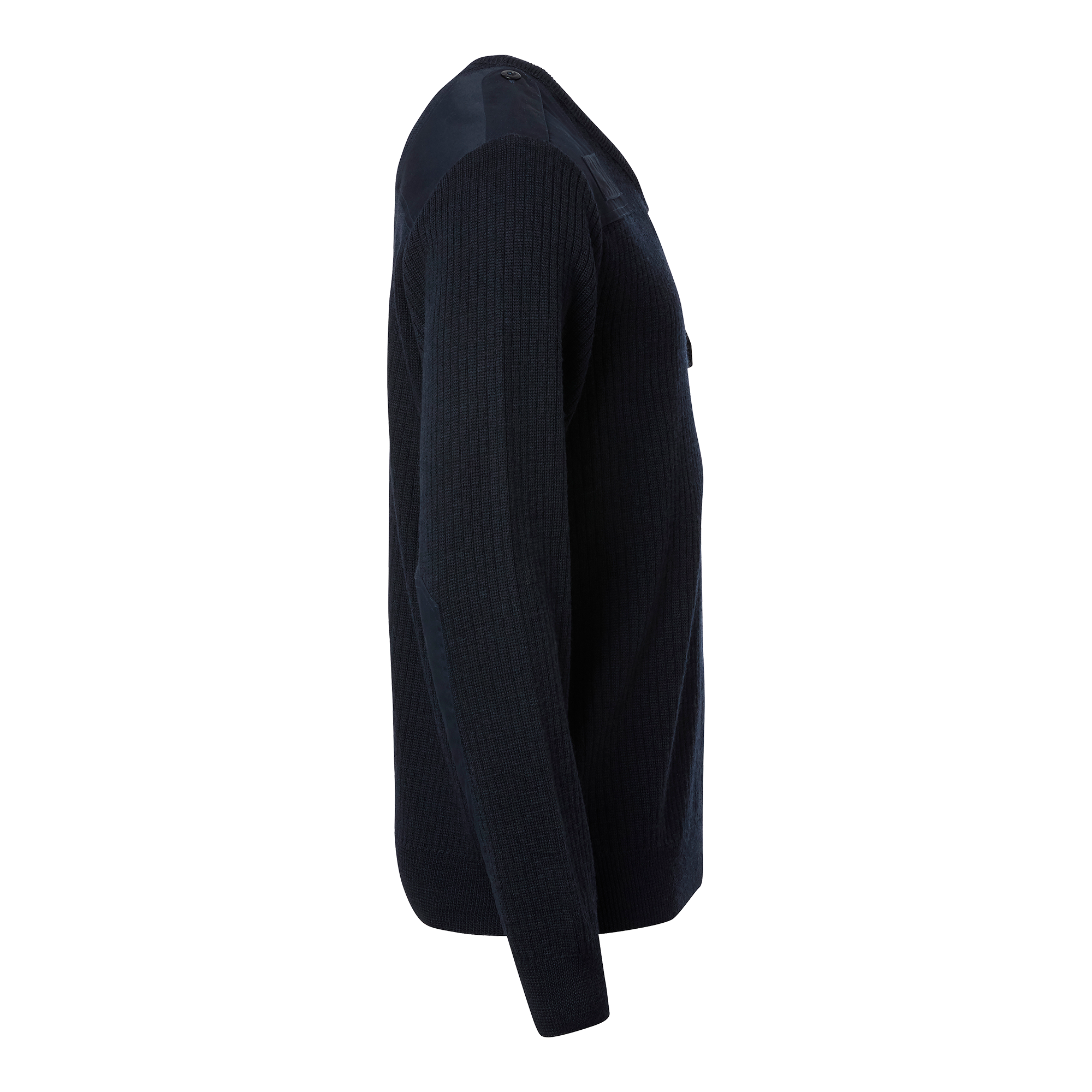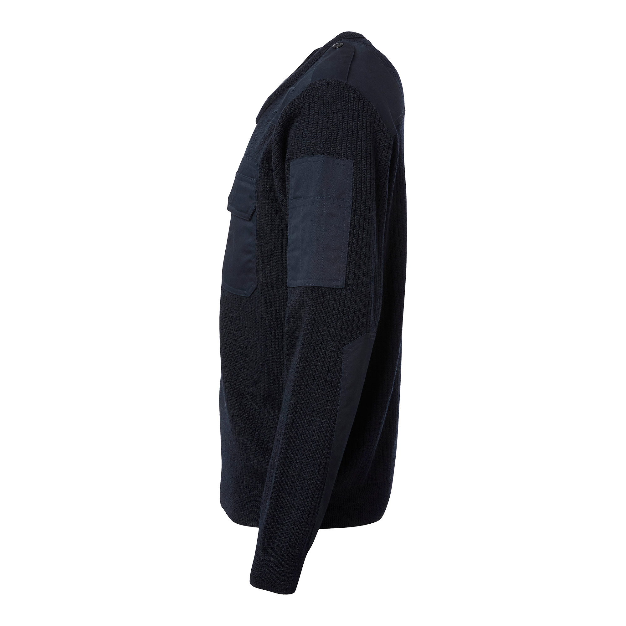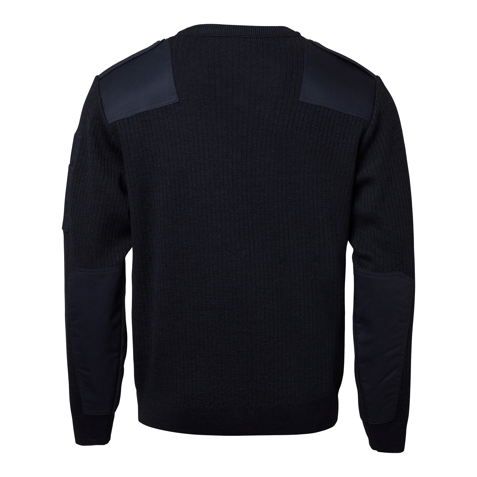 Klassisk NATO pullover med v-ringad hals. Tröjan har förstärkningar vid axelparti och armbågar. Nederkant och ärmslut i 1x1 rib med elastane som håller passformen. Utrustad med monofonhållare, axelklaffar med plats för gradbeteckning, samt en ficka på bröstet och en på ärmen.