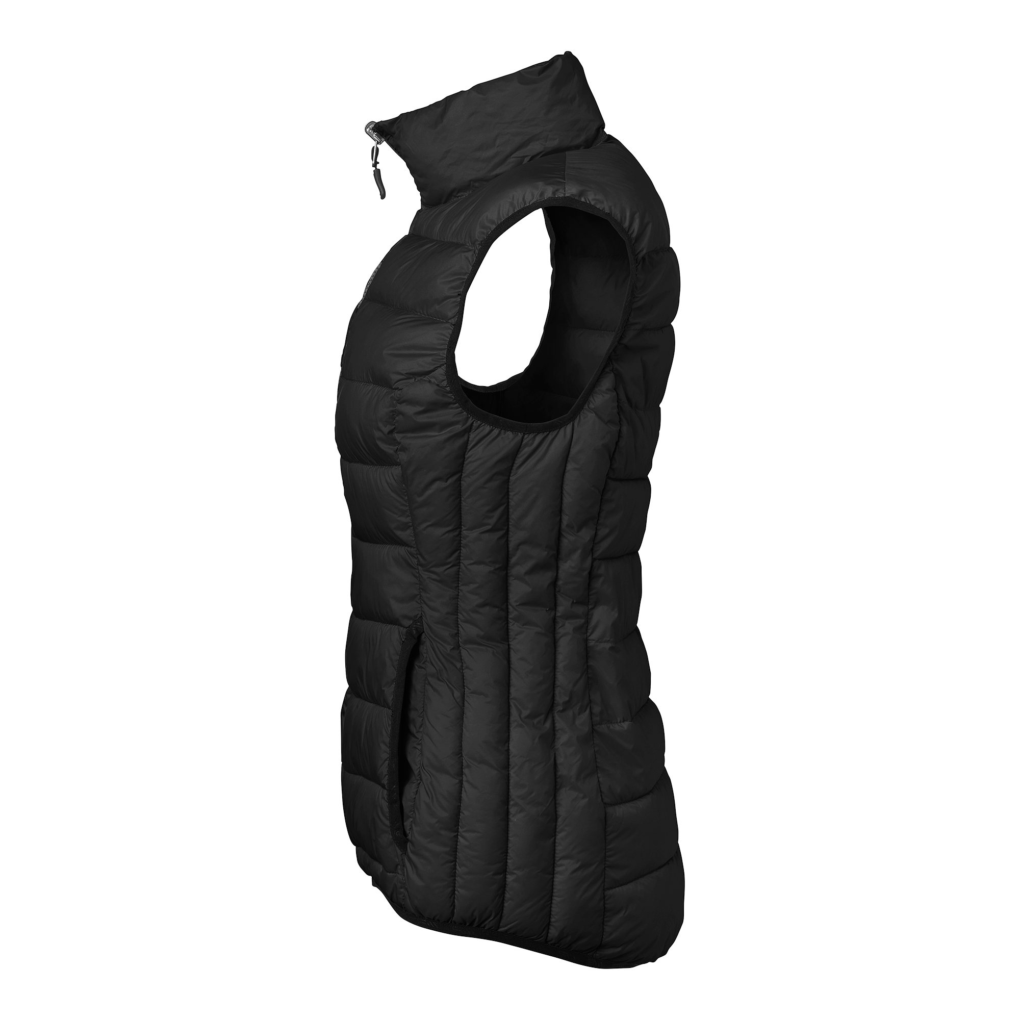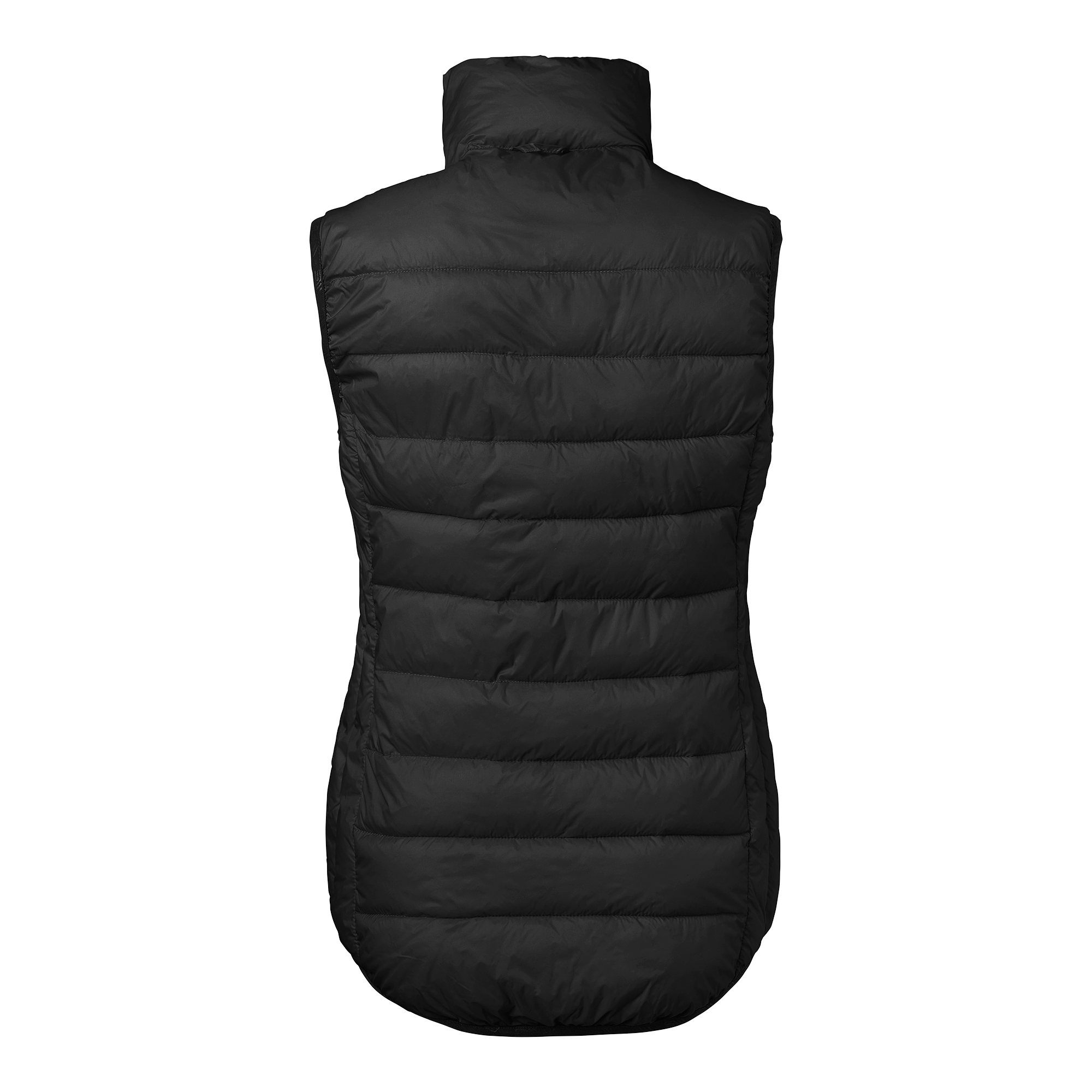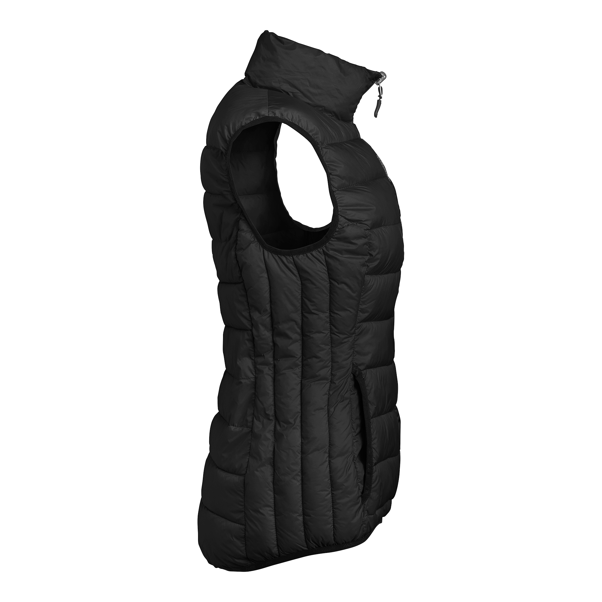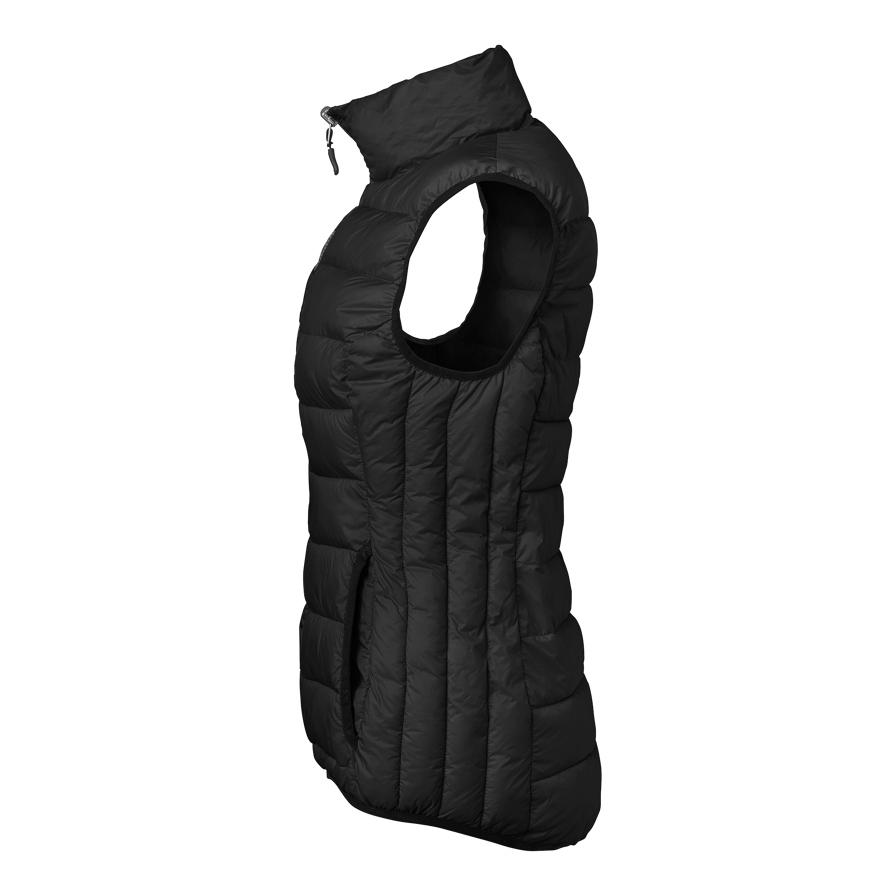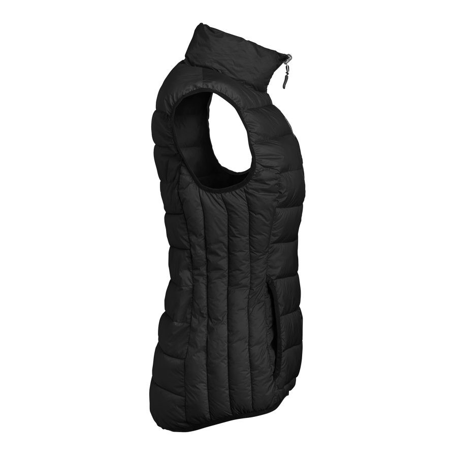 Lättviktsväst med fuskdun och figurnära passform. Kan användas ensam eller fästas i Alma skaljacka som värmande bålfoder. Smala kanaler håller dunet på plats. Två sidofickor. Elastiska band i nederkant och ärmhål.