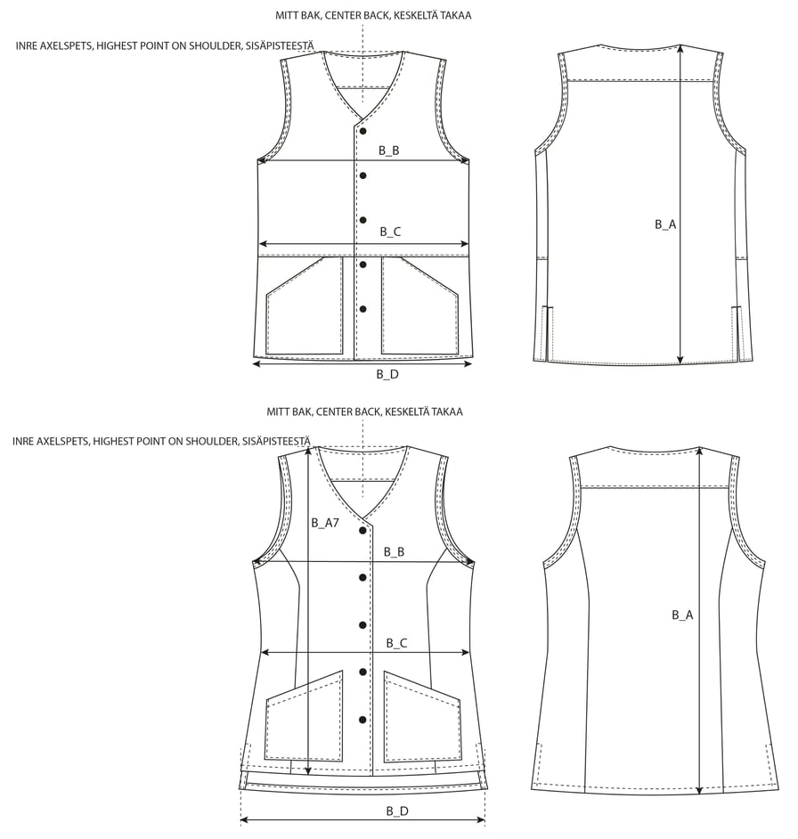 Unisexväst med slitsar i nederkant och tryckknappar i framkant. Utrustad med bröstficka och två snedställda fickor fram.