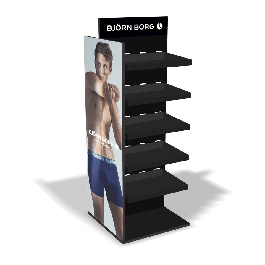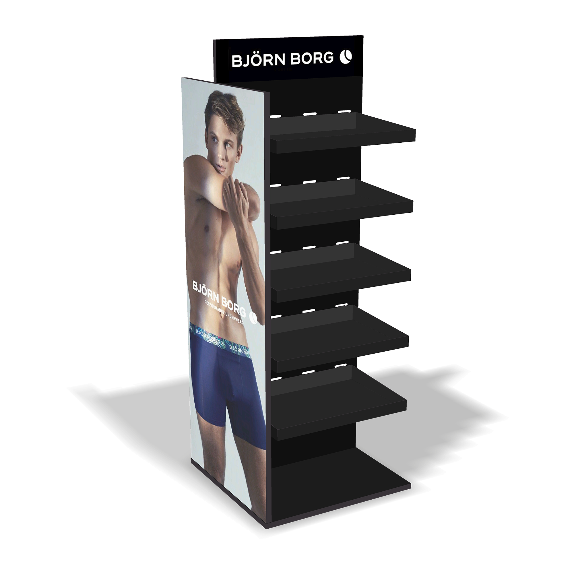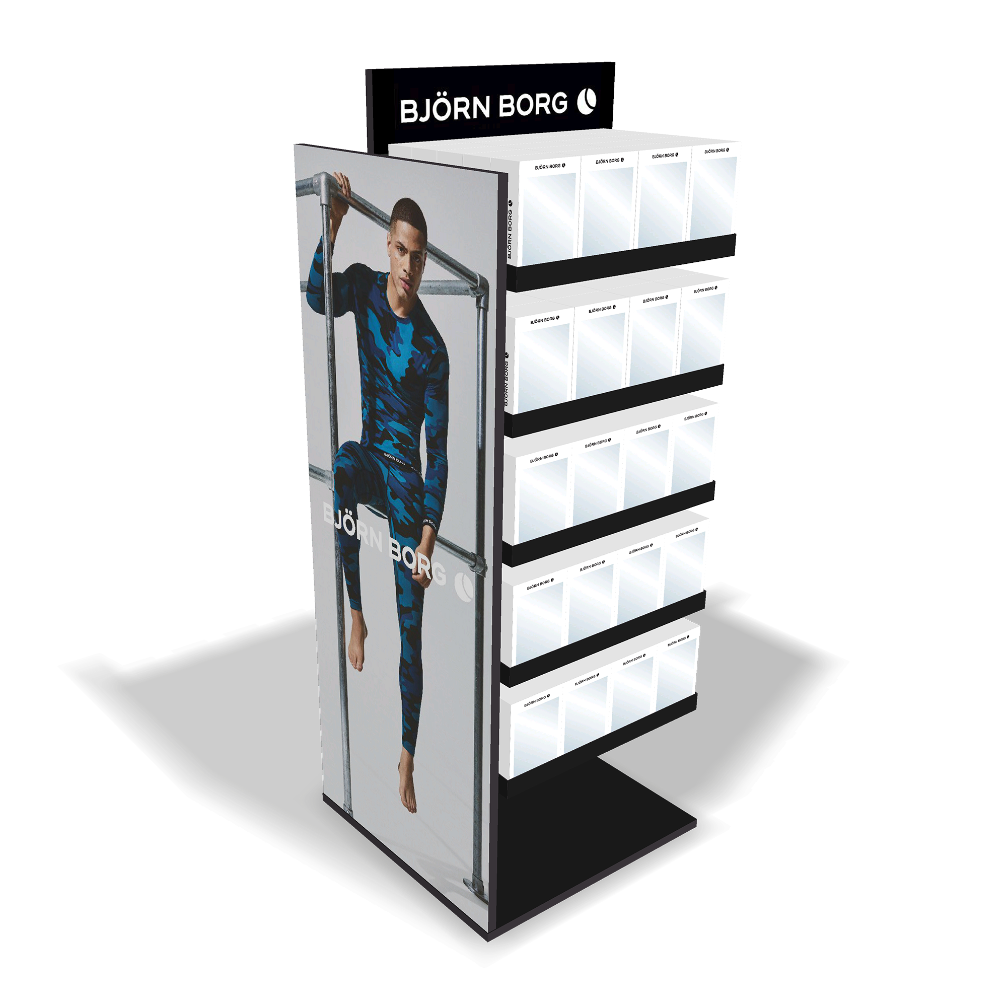 Golvdisplay för underkläder från Björn Borg. Ett snyggt sätt att presentera alla nyheter i butik. Rymmer 144 pcs 3-pack på hyllorna och 112 pcs 1-pack på spjuten. D 60 cm x W 58 cm x H 160 cm Utan kostnad vid köp av 200 pcs, kontakta din säljare för mer information.