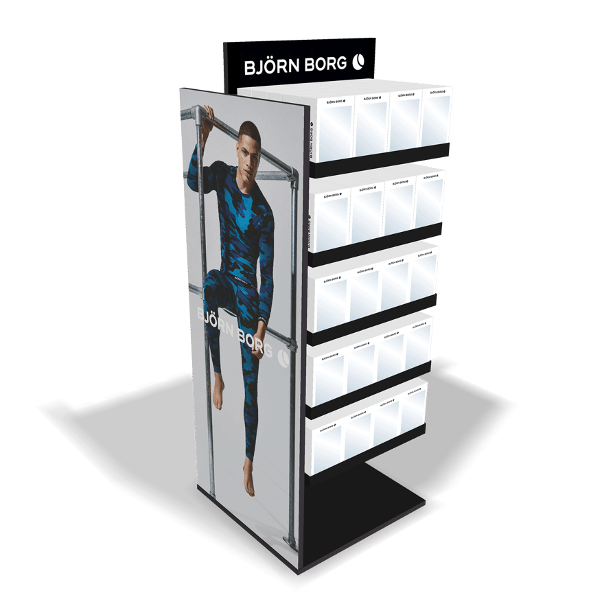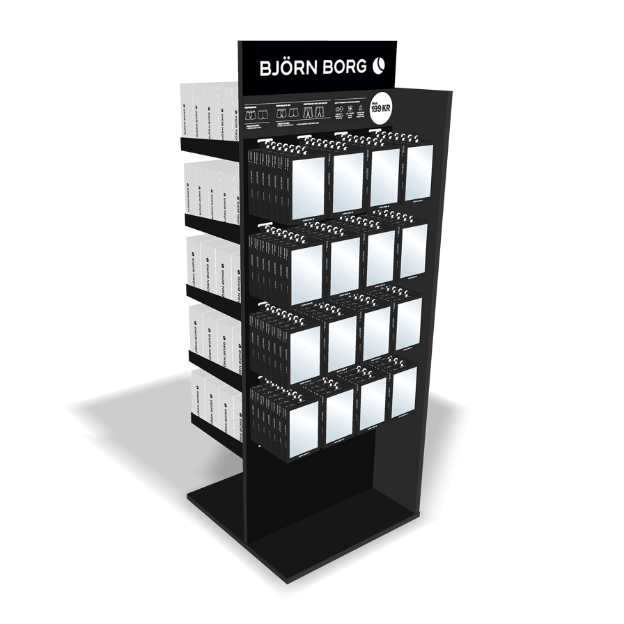Golvdisplay för underkläder från Björn Borg. Ett snyggt sätt att presentera alla nyheter i butik. Rymmer 144 pcs 3-pack på hyllorna och 112 pcs 1-pack på spjuten. D 60 cm x W 58 cm x H 160 cm Utan kostnad vid köp av 200 pcs, kontakta din säljare för mer information.