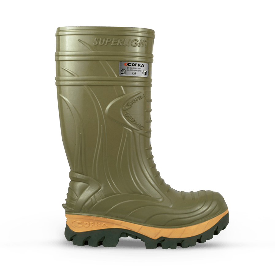 Cofra Thermic S5 Safety Boot är en extra lätt och flexibel PU-gummistövel med glasfibertåhätta och APT Plate spikskydd. Stöveln har en isolerande iläggssula av PU och en nitrilgummi yttersula för överlägsen halksäkerhet och slitstyrka.