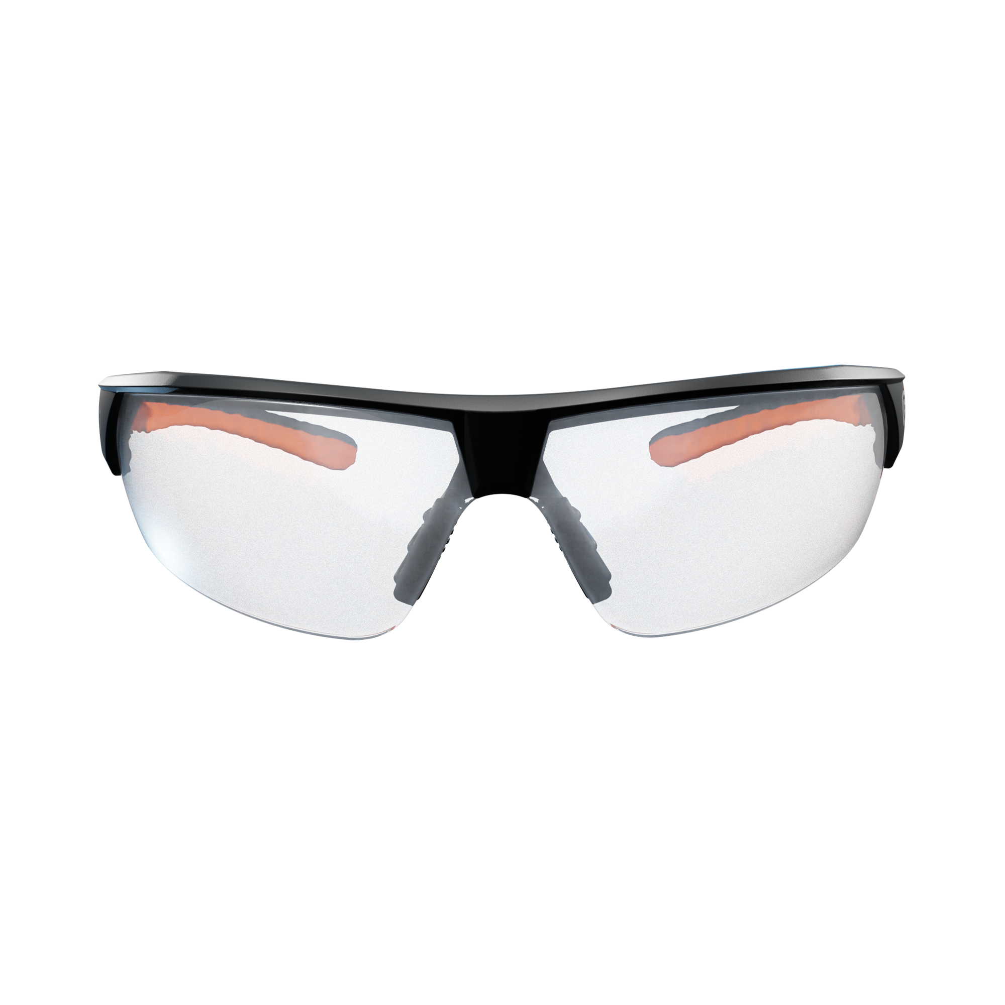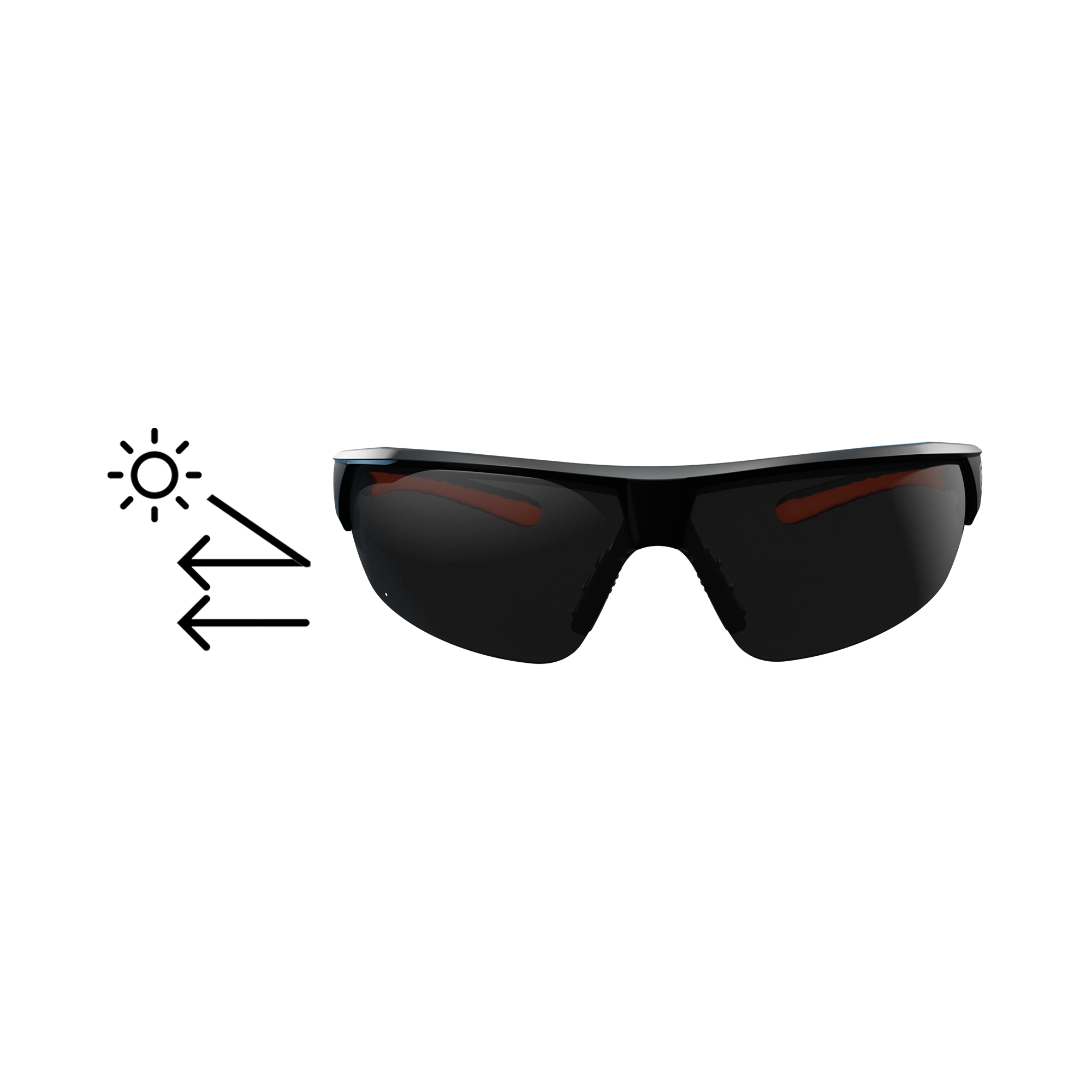 Skyddsglasögon med fotochromiska linser som ändrar färg efter UV-ljus. Tunna skalmar för minimalt bullerläckage, bekväm näsbrygga och vinklade skalmar.