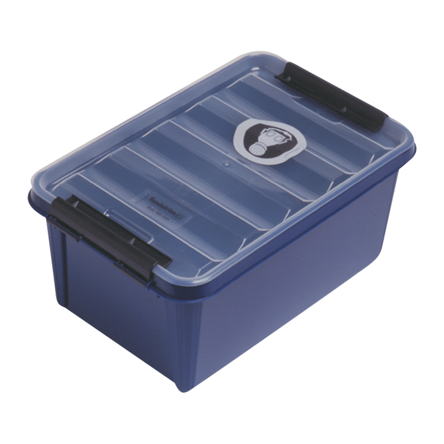 SR 344 är avsedd för stationär förvaring av större andningsskyddsprodukter, t ex helmask SR 200 med filter och tillbehör. Locket hålls på plats med hjälp av två byglar.