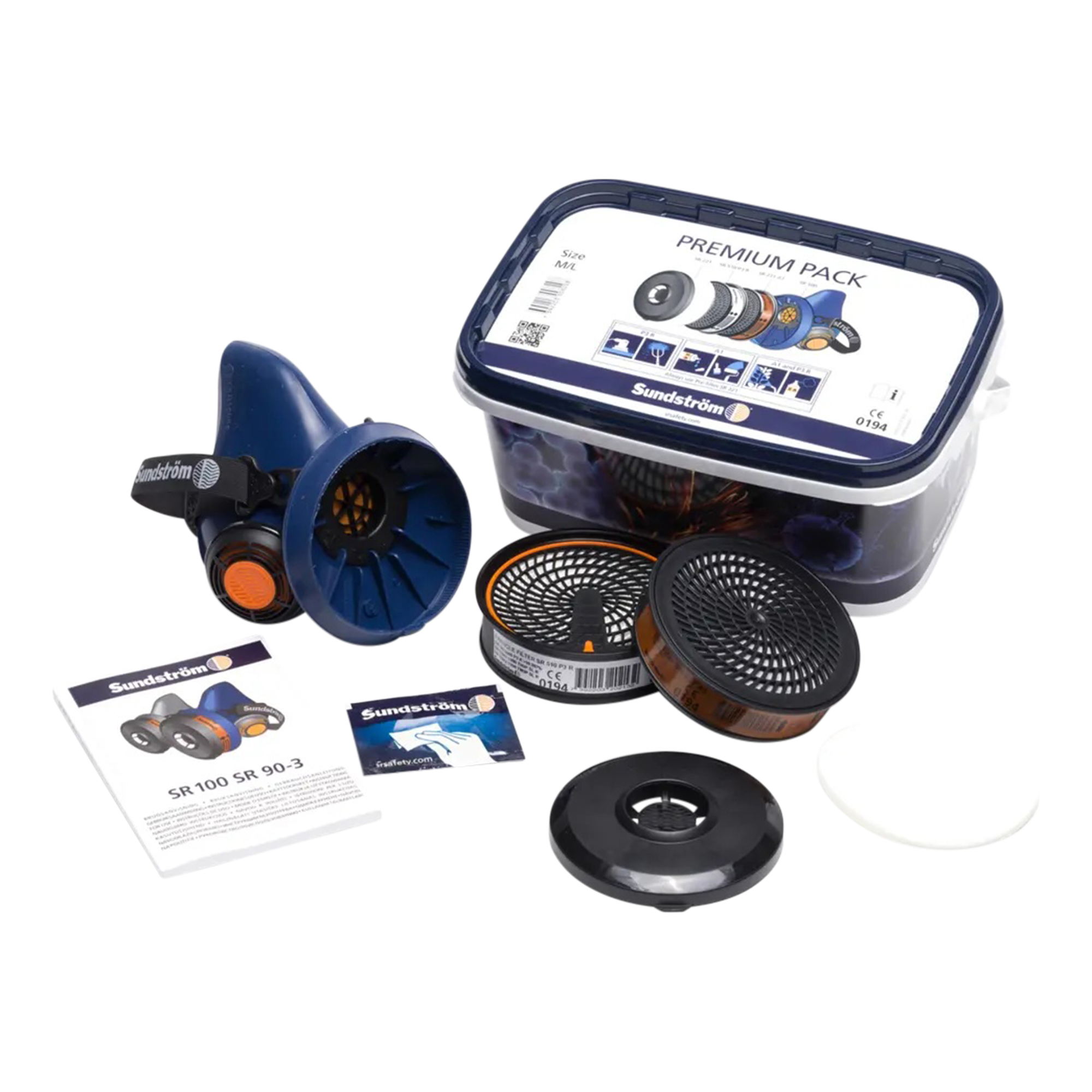 Halvmask SR 100/partikelfilter SR 510 P3 R/gasfilter SR 217 A1/förfilter/förfilterhållare/rengöringsservett.