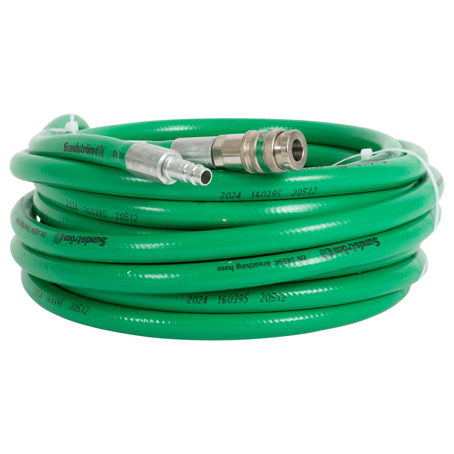Godkända tryckluftsslangar med säkerhetskopplingar för direkt anslutning till tryckluftsfilter och tryckluftsmatade andningsskydd.