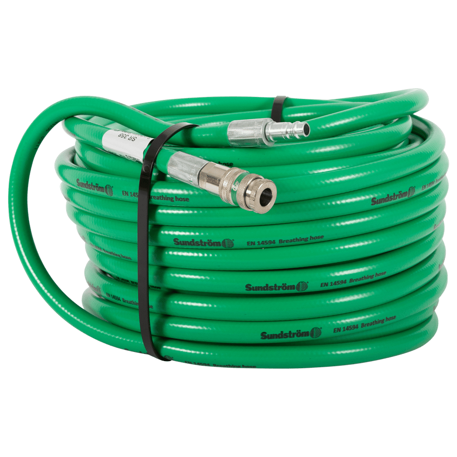 Godkända tryckluftsslangar med säkerhetskopplingar för direkt anslutning till tryckluftsfilter och tryckluftsmatade andningsskydd.